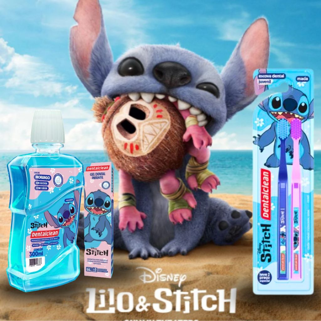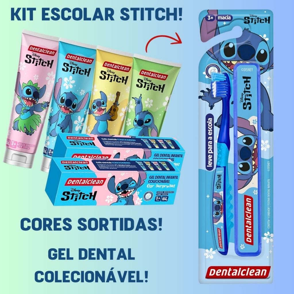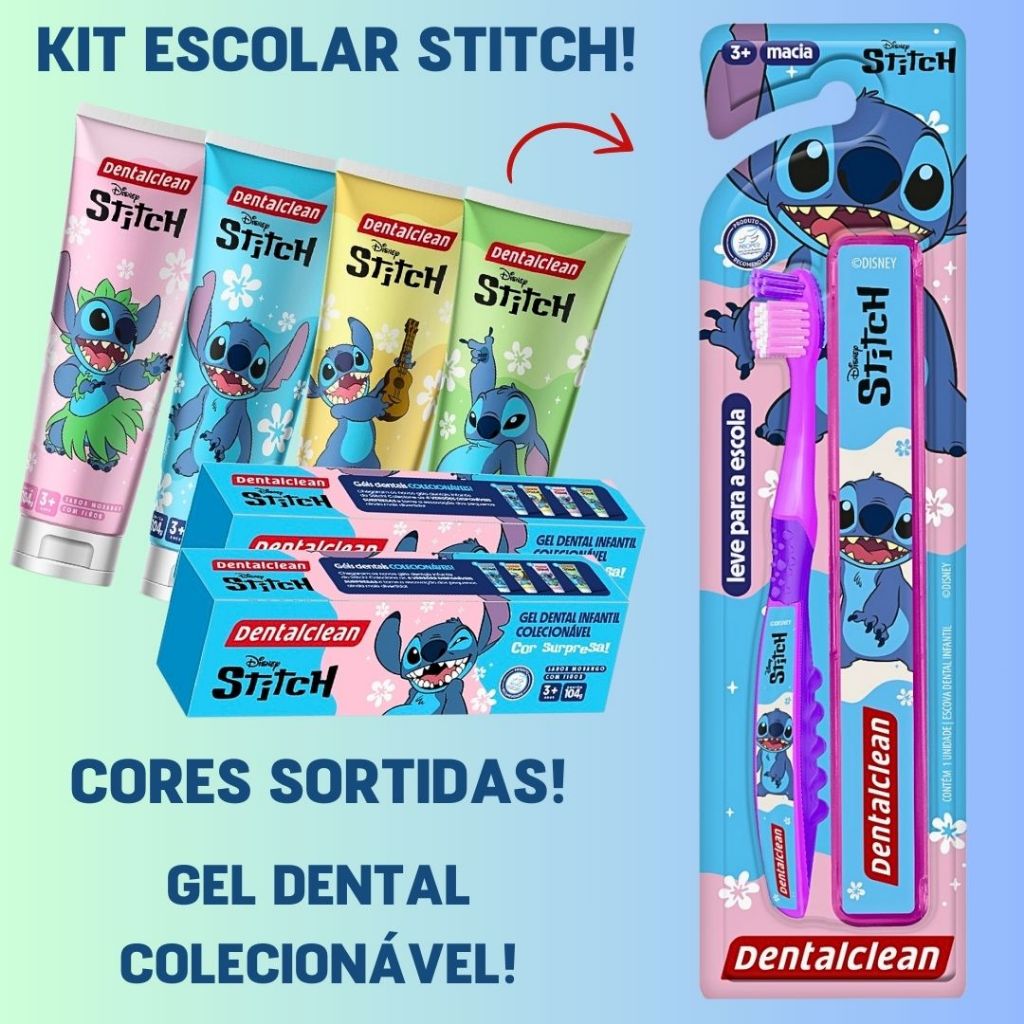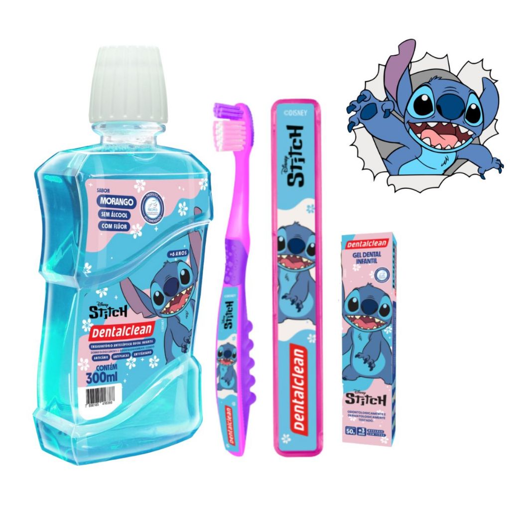 Kit Escolar Dental Gel Dentes Escova Macia Infantil Stitch Disney Cerdas Estojo Juvenil Flúor
