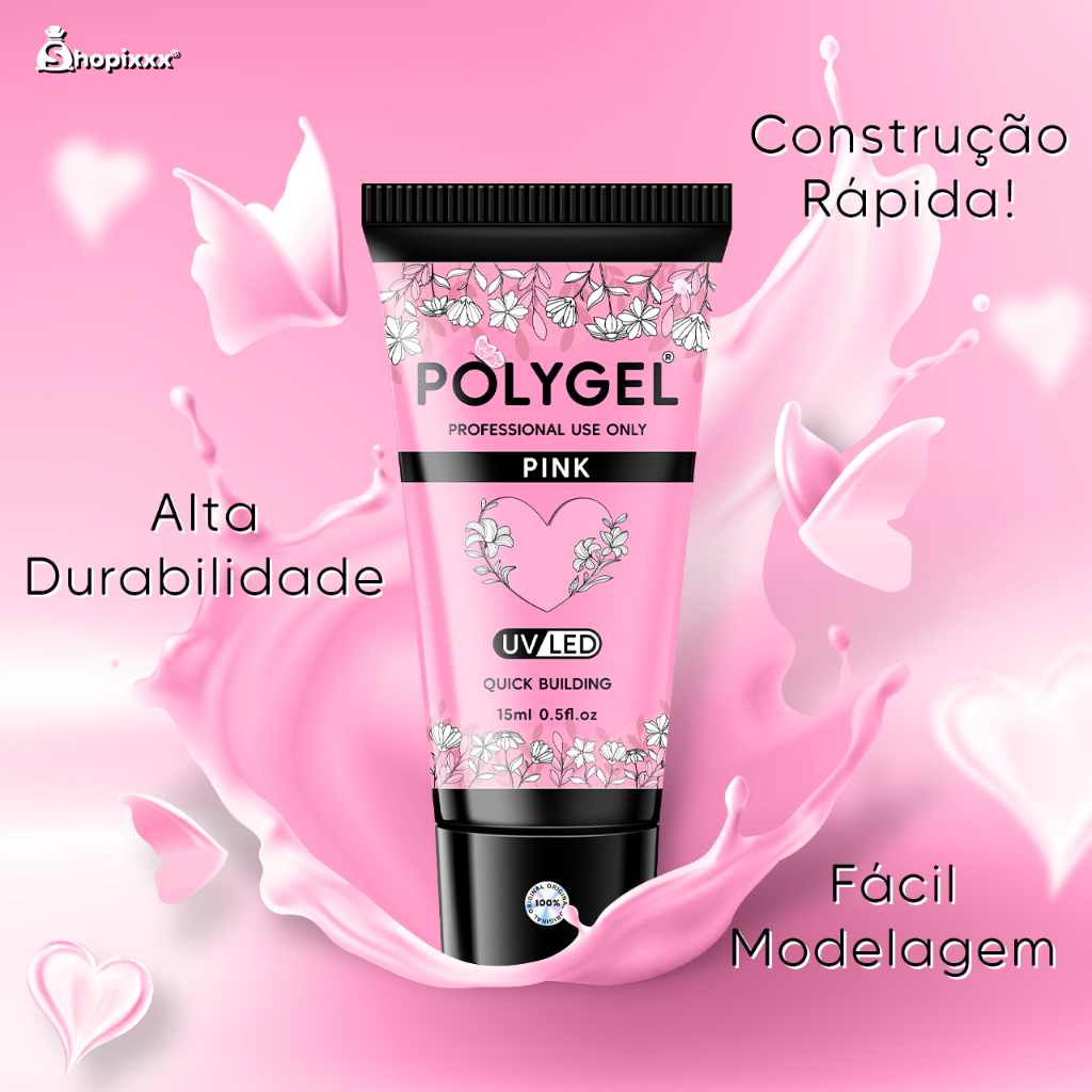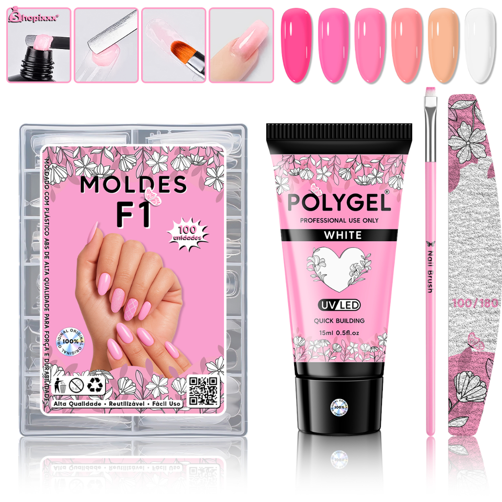 Kit Alongamento Poligel Polygel + Molde F1 + Lixa de Unha + Pincel De Aplicação para Unhas
