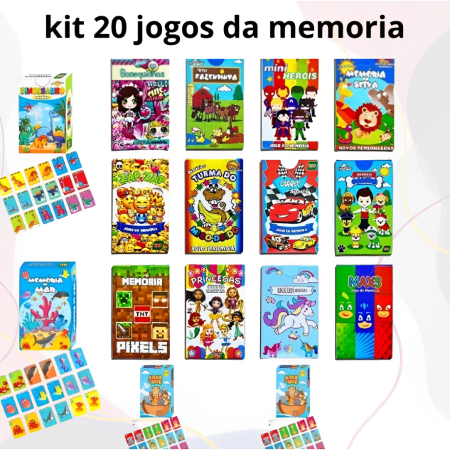 Kit 20 Caixinhas de Massinha 65gr+20 Forminhas+20 Jogos da Memória Sortidos Brinquedo Lembrancinha Infantil Festa