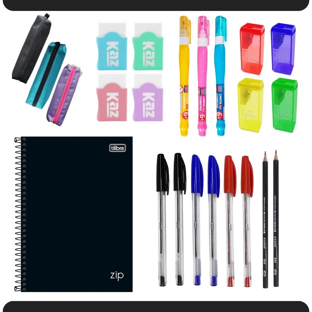 Kit Material Escolar Faculdade 13 Itens Papelaria Estudo Caderno Lápis Caneta Borracha Aluno Estojo