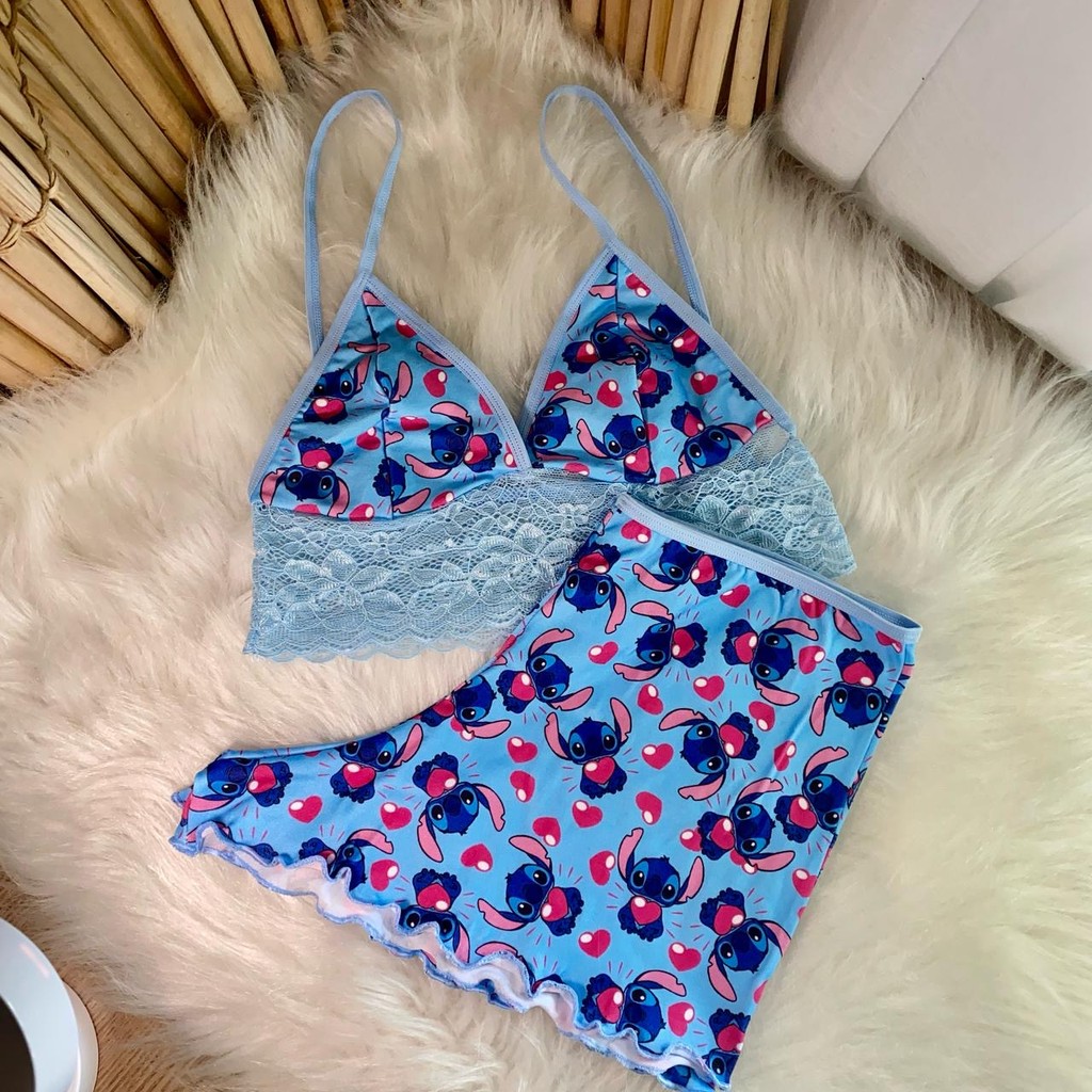 Pijama Estampado Personagens Bady Doll Suede Com Detalhe de Renda Roupa de Dormir Top Doll
