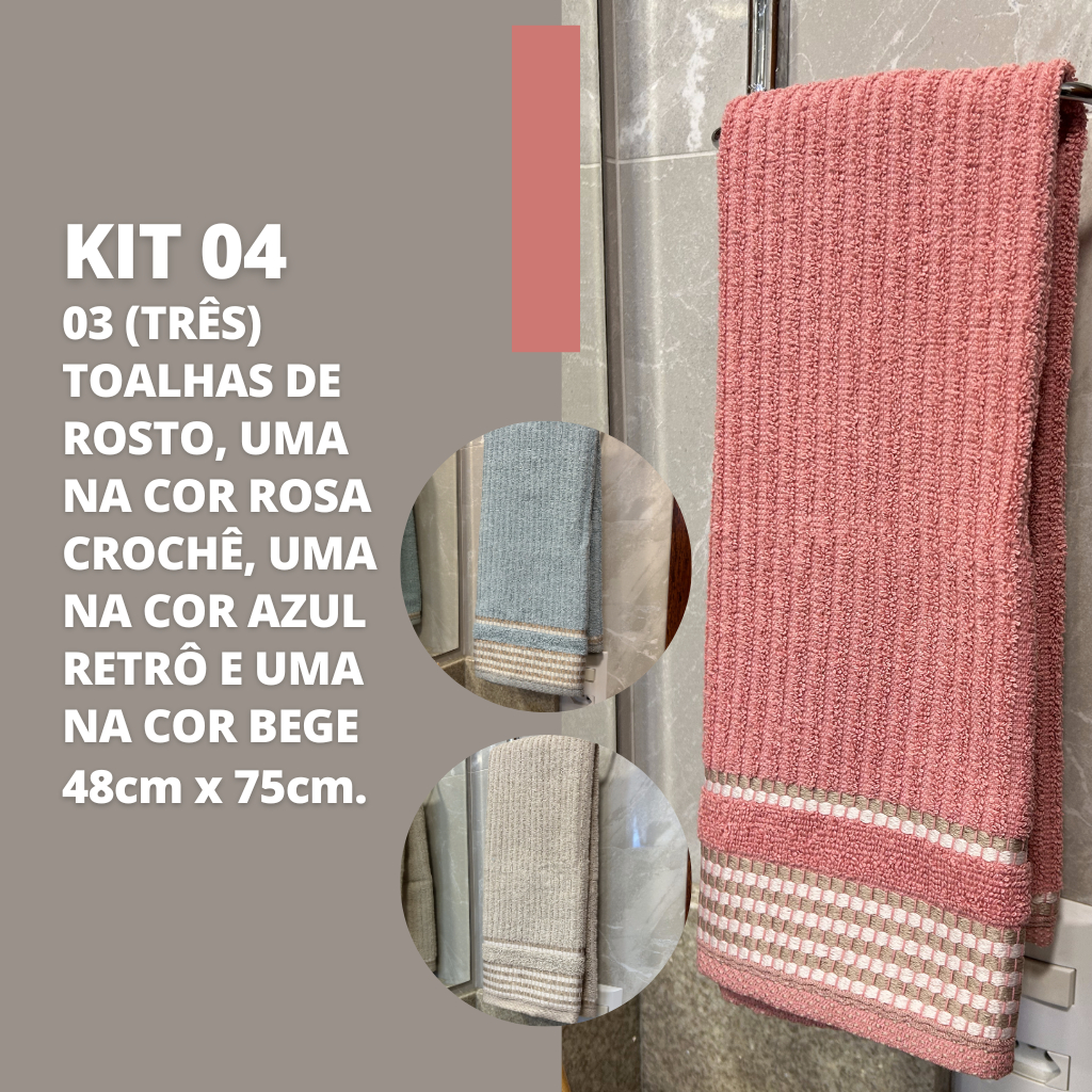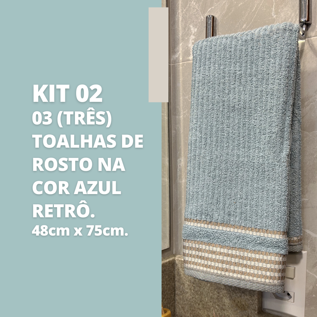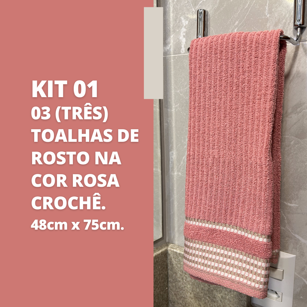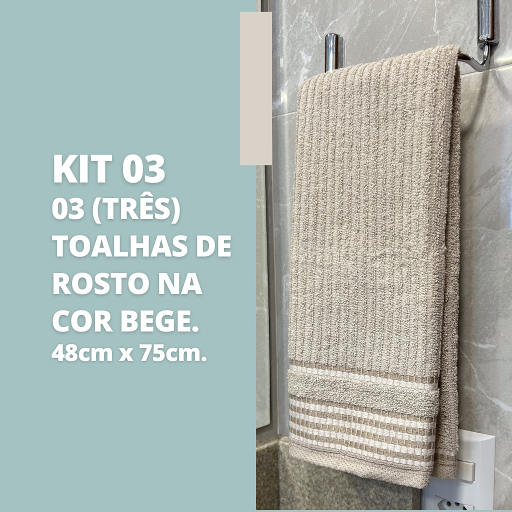 Kit 3 Toalhas de Rosto Tóquio Canelada 100% 48cm x 75cm Algodão Costura Automatica