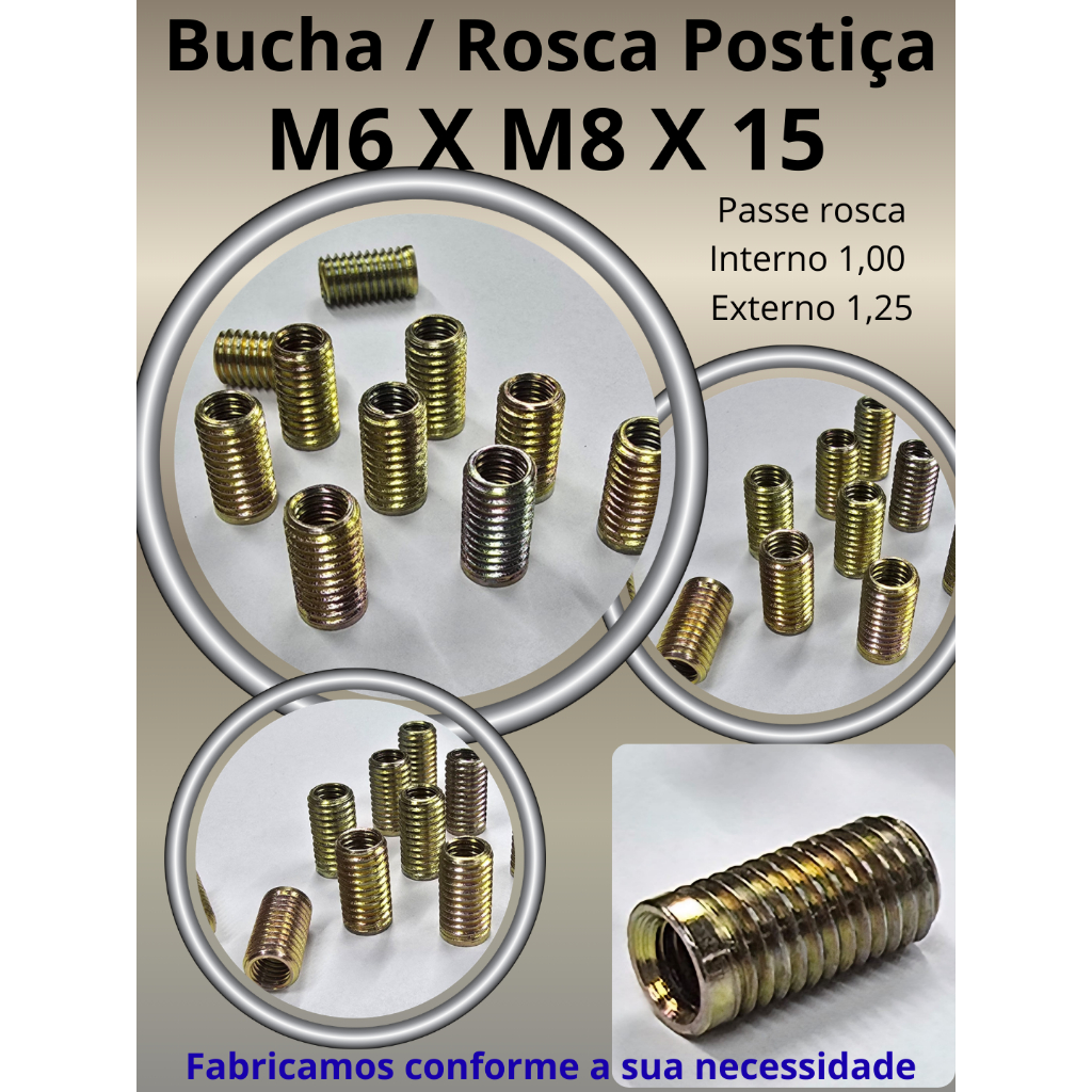 Rosca Postiça M6 x M8 x 15 – em aço, alta durabilidade – Bucha roscada / Bucha Postiça / Tucho