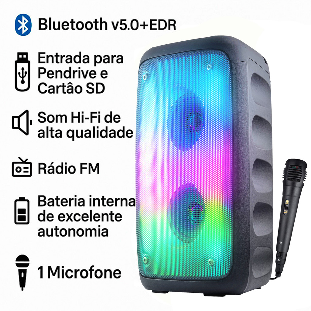 Caixa de Som Bluetooth LED RGB PartyBox Wireless Subwoofer Karaokê Com Microfone
