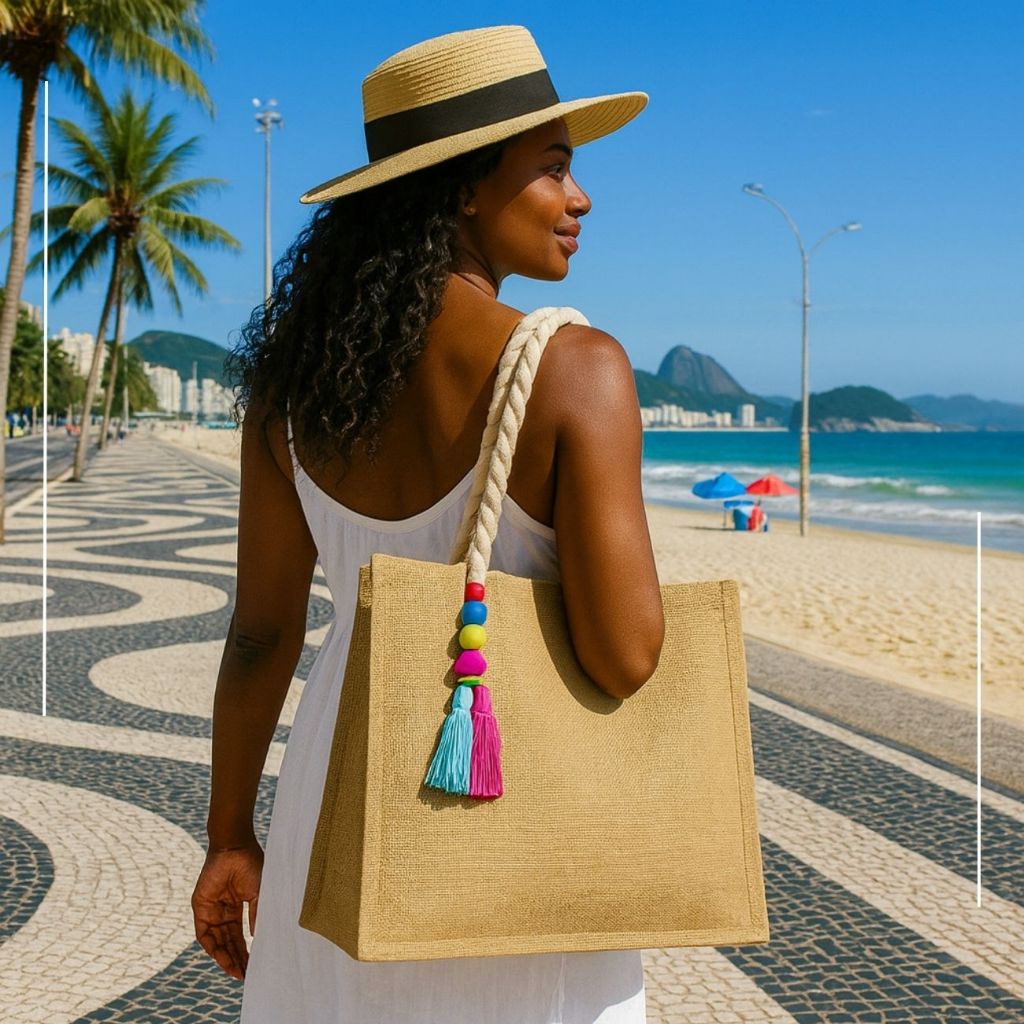 Bolsa de Praia Feminina Grande Espaçosa Com Alça de Corda + Chapéu Paris Kit Verão - Envio Imediato