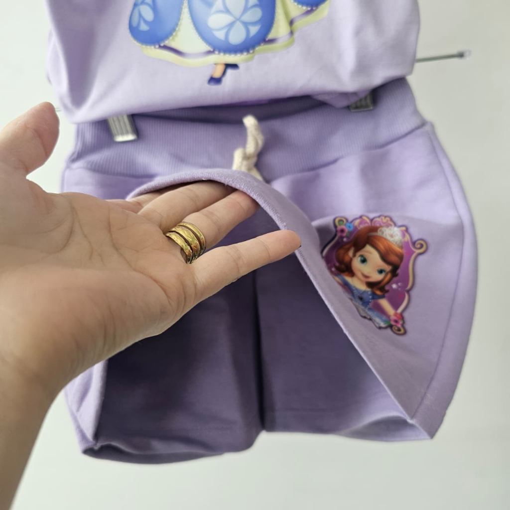 conjunto verão feminino camiseta e shorts saia lilas princesa sofia