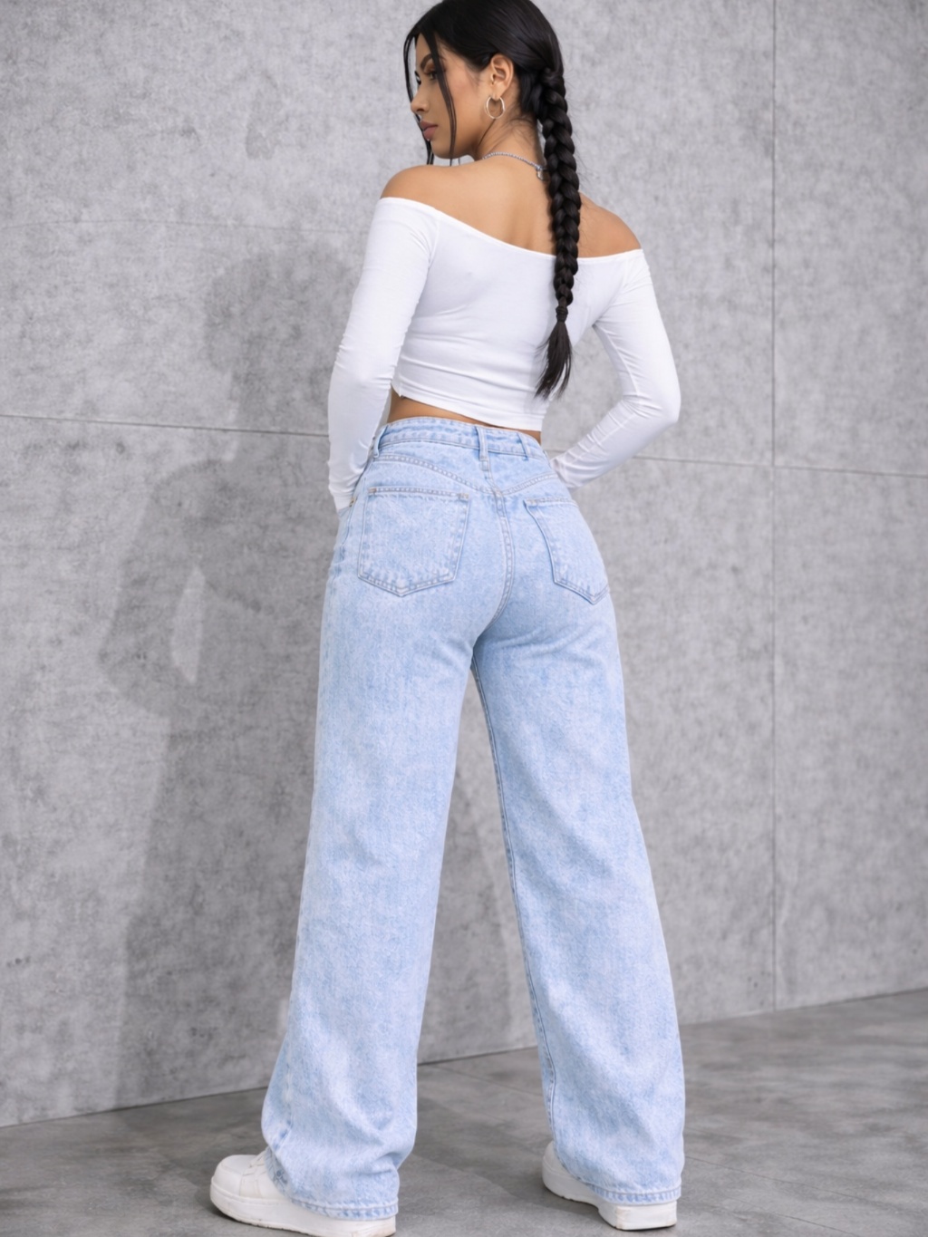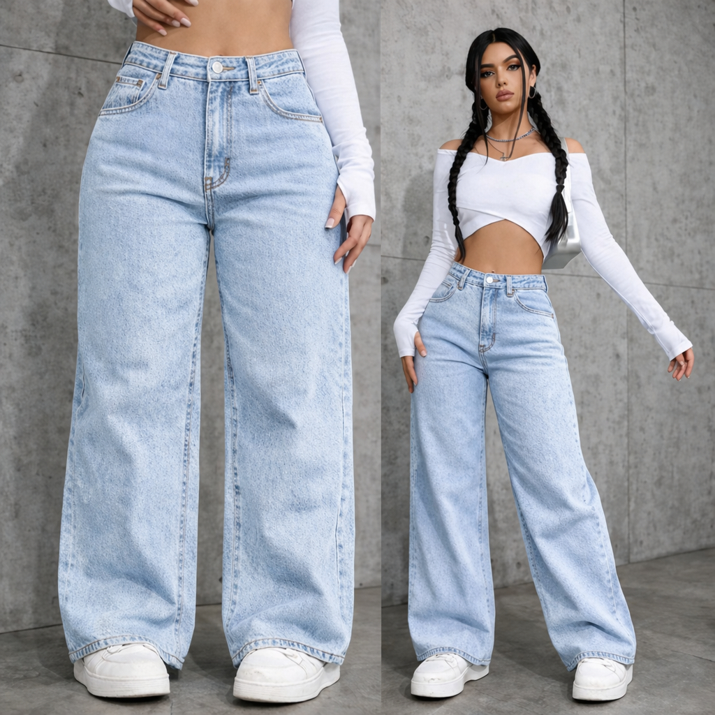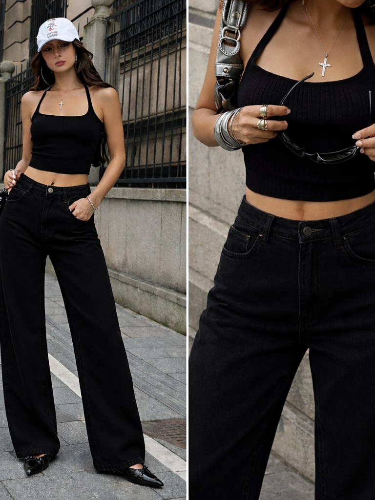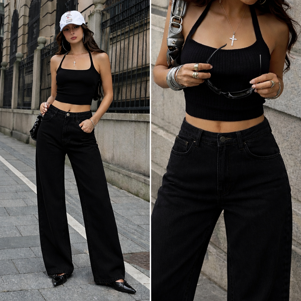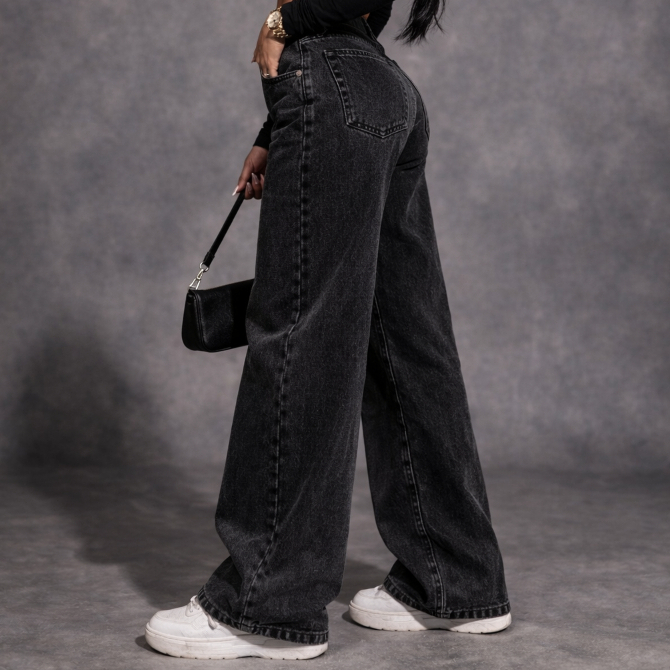 Calça Jeans feminina Wide Leg Preta Marmorizada Pantalona boca larga - cintura alta premium