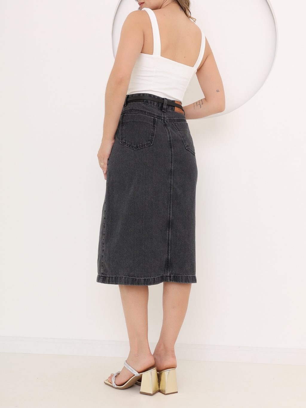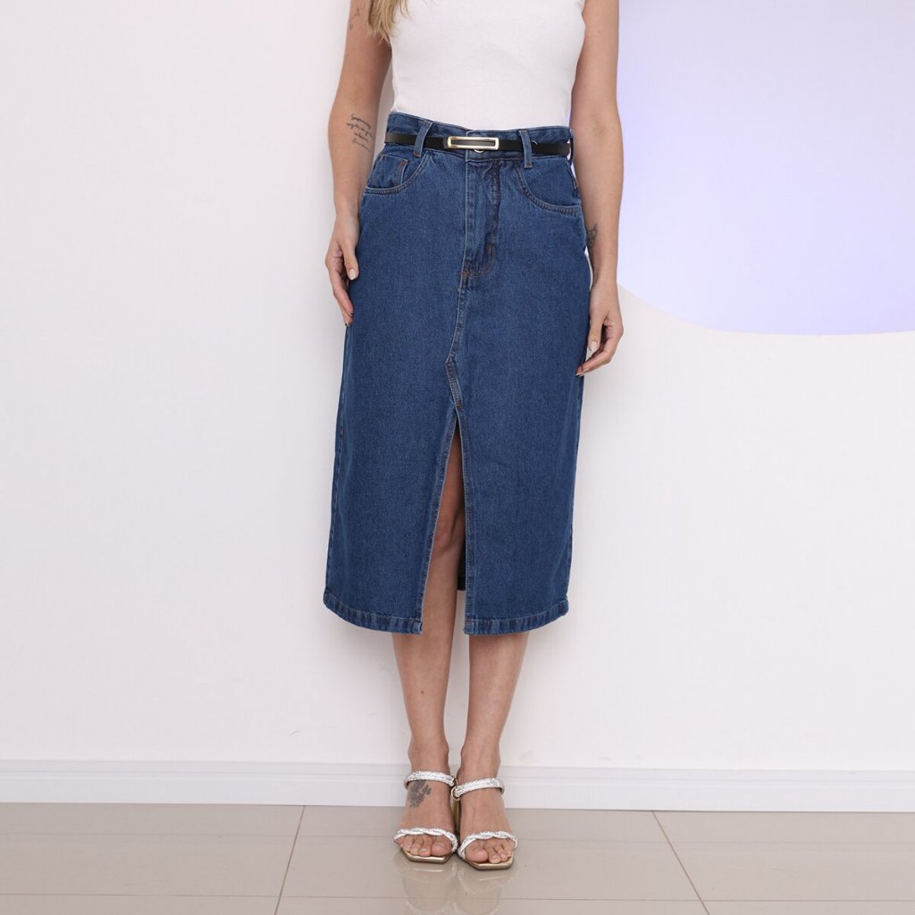 Saia jeans midi com fenda acompanha cinto