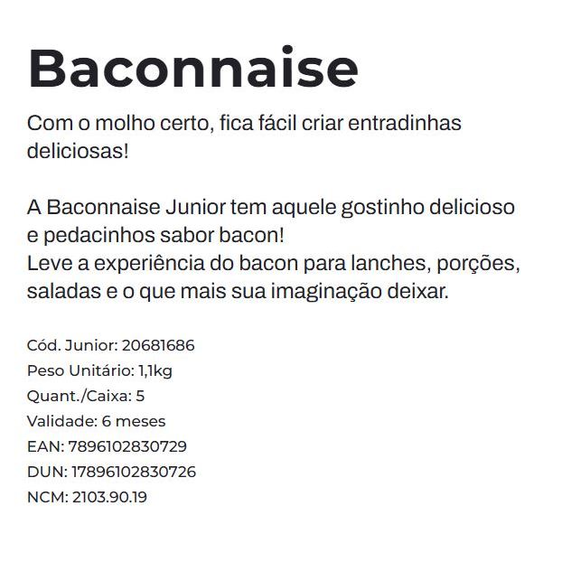 Baconnaise Bag Junior 1,1 kg Bag / Baconese / Maionese sabor bacon Junior 1,1 Kg / Molho Bacon