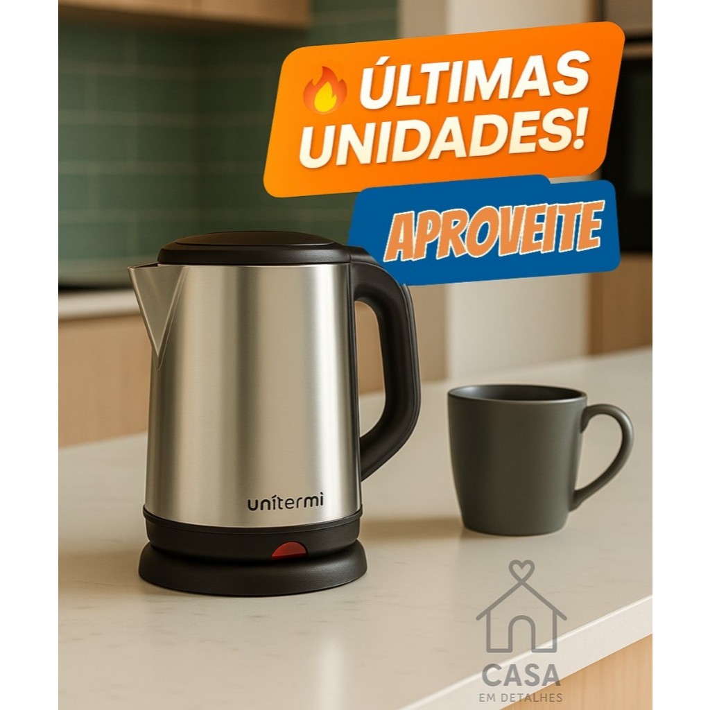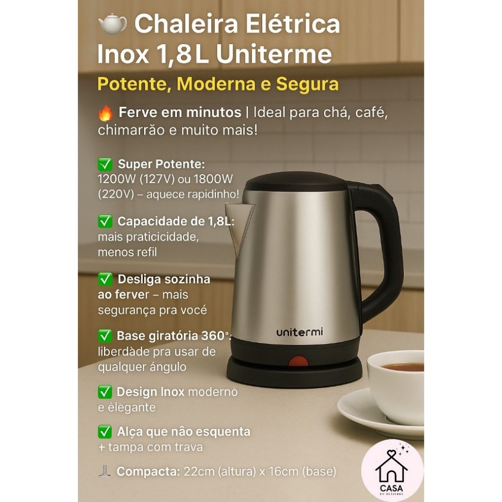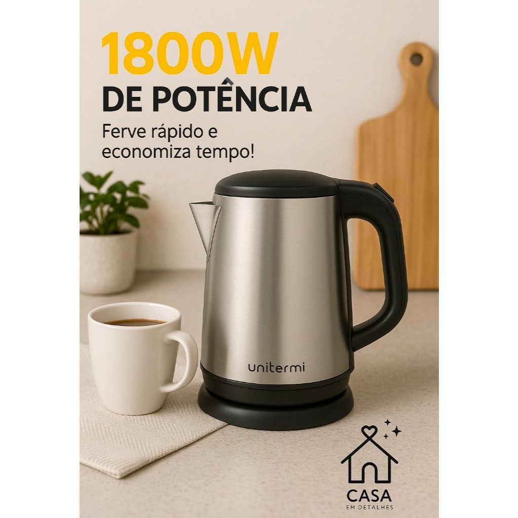 Chaleira Elétrica Inox 1,8L 1800W com Desligamento Automático Chá, Café e Chimarrão – Base 360° 127V / 220V