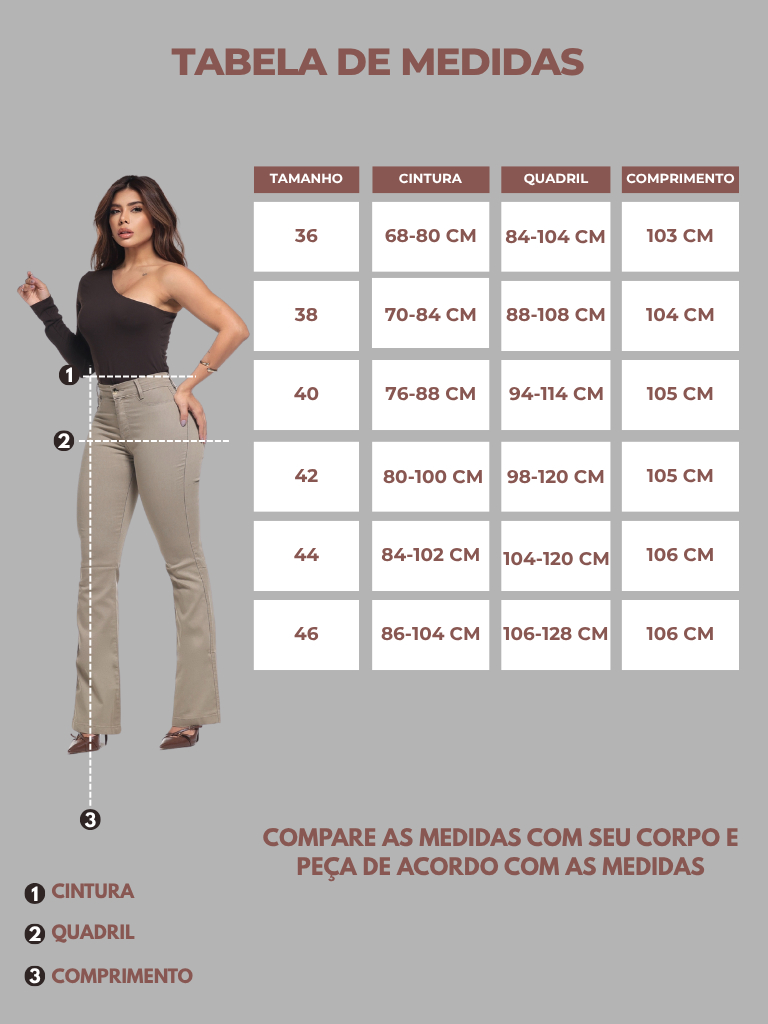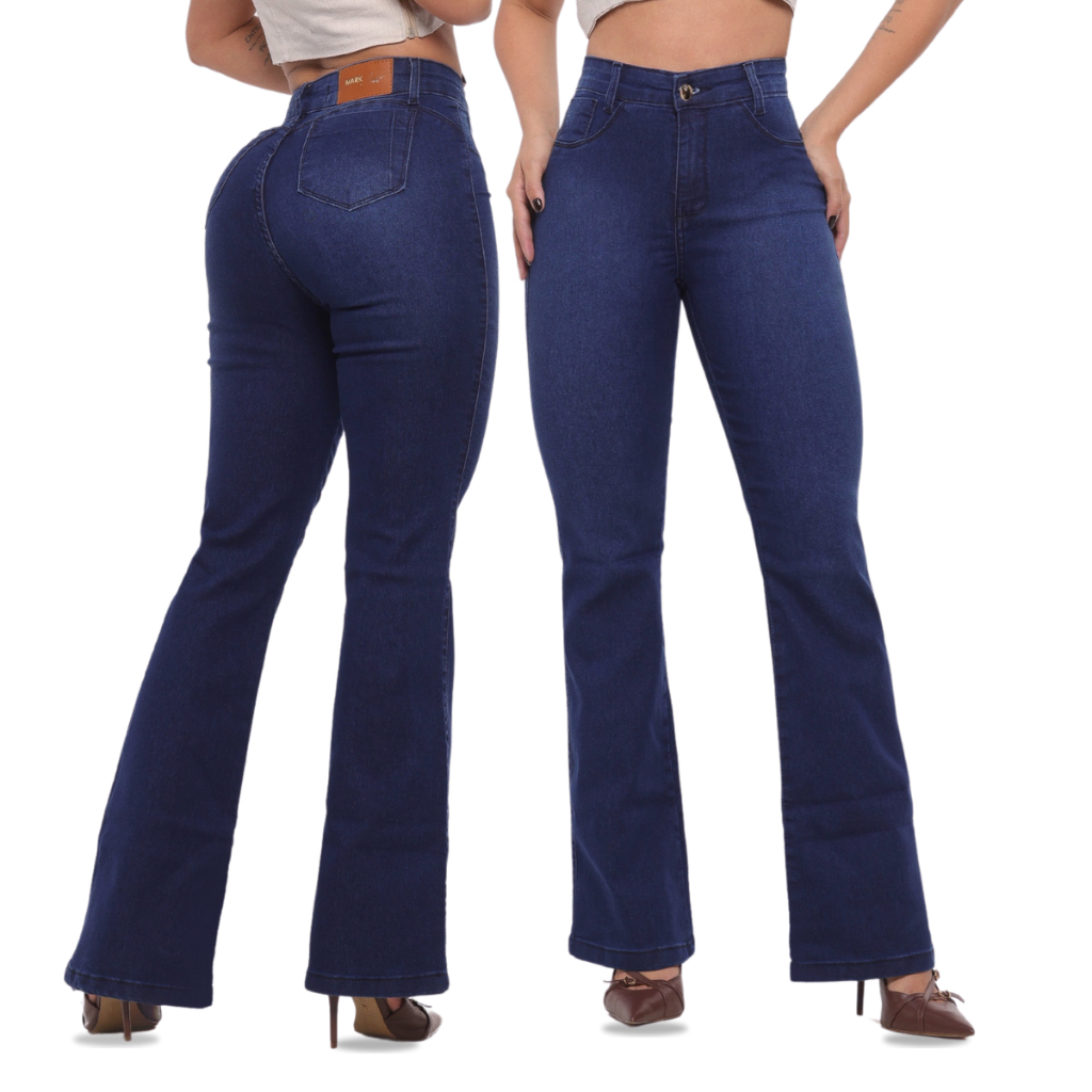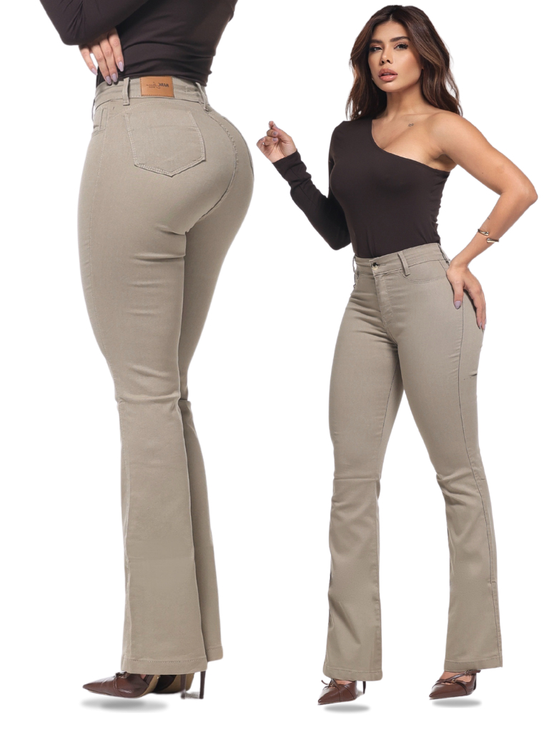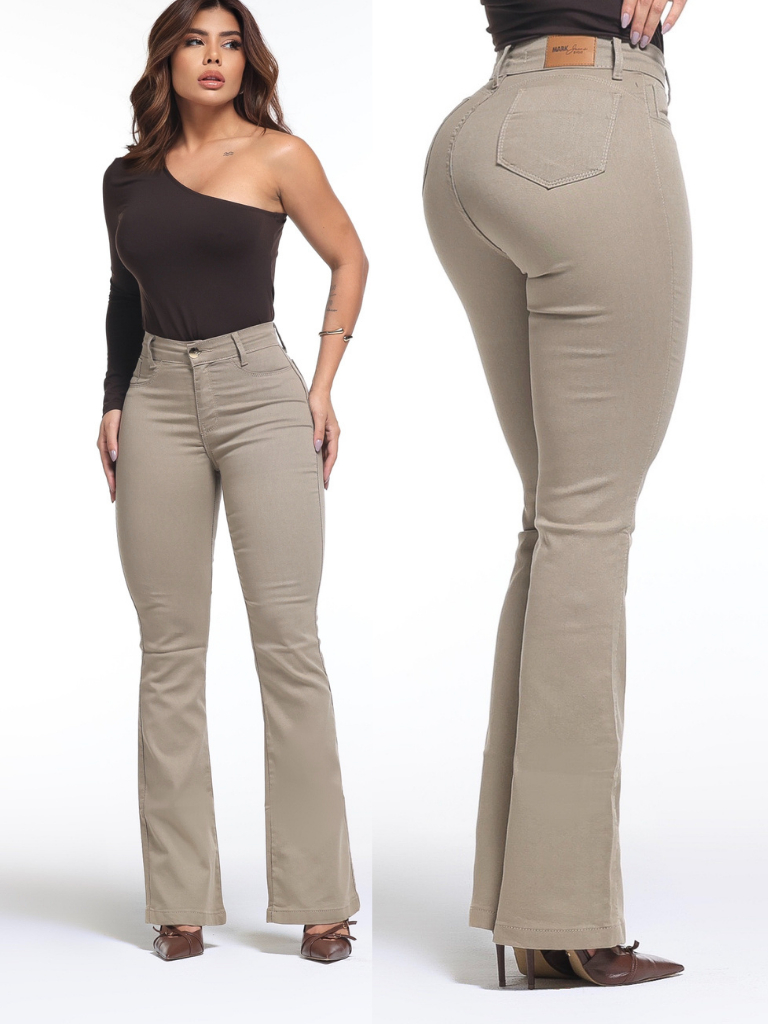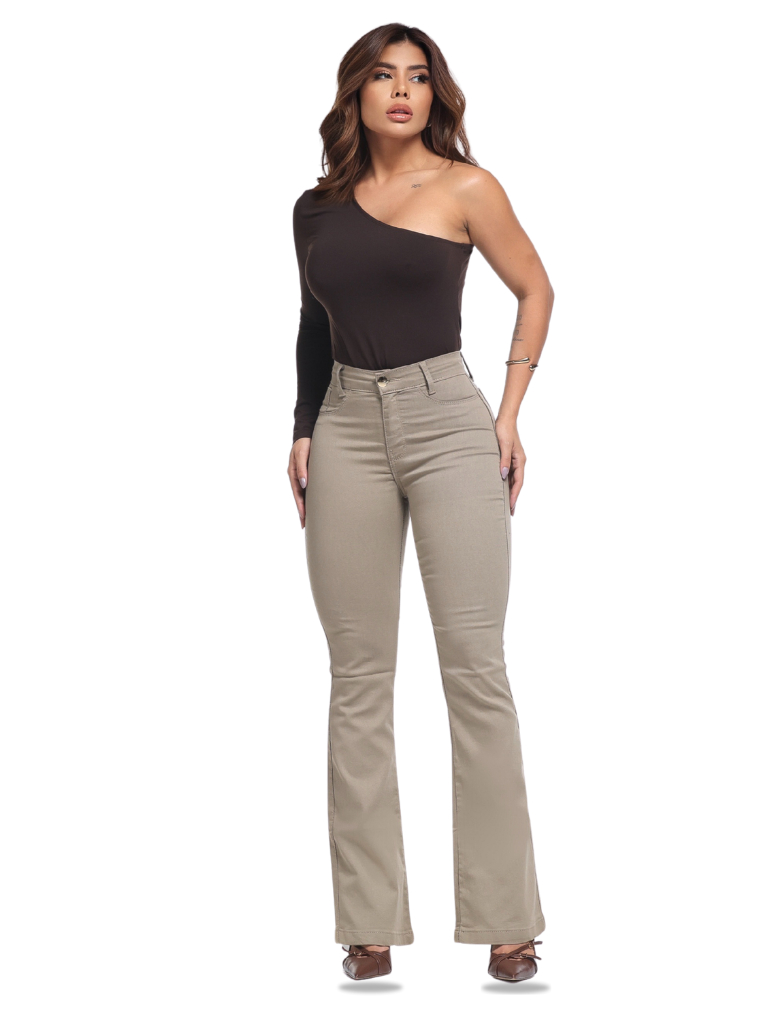 Calça Feminina Flare Pantalona Bege Jeans Premium Empina Bumbum Boca de Sino Cos Alto Com Elastano