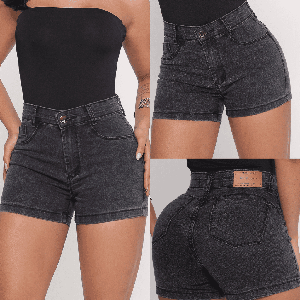 Short Feminino Jeans Bege Cintura Alto Desfiado Com Lycra Curto Levanta Bumbum Brim Elastano