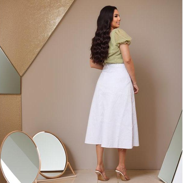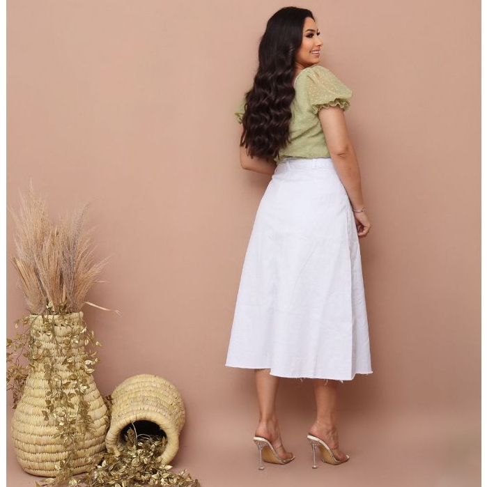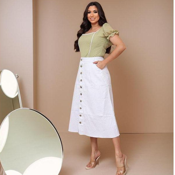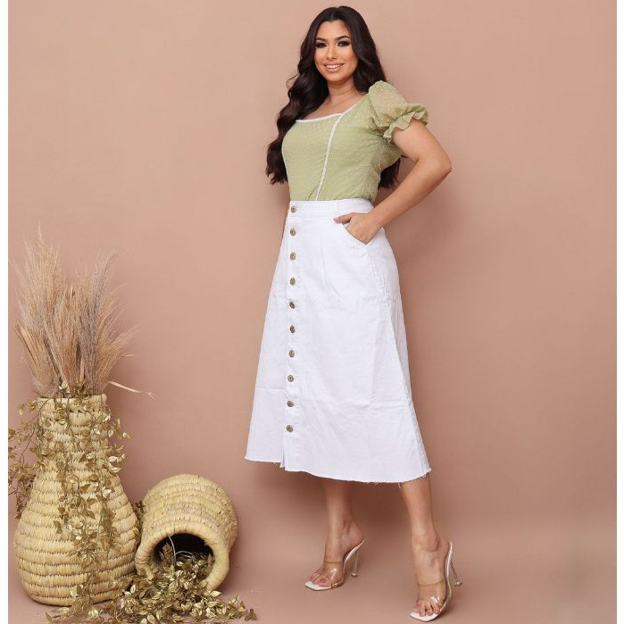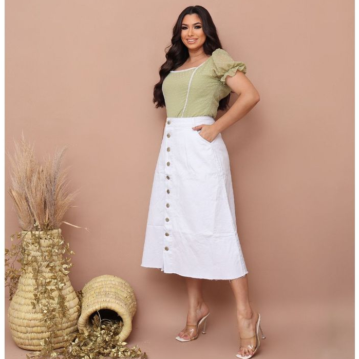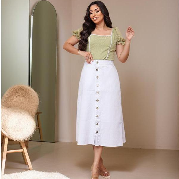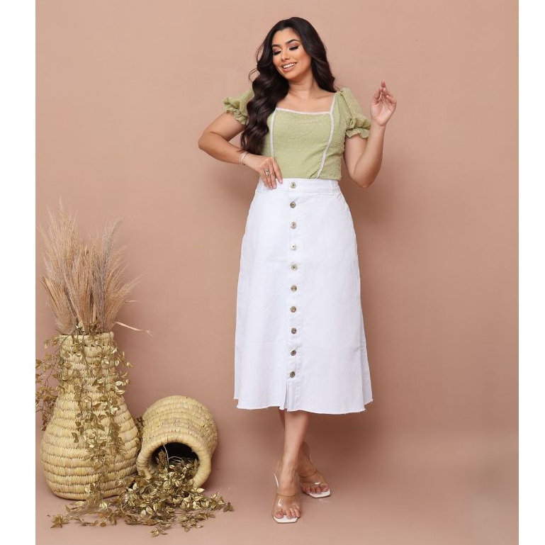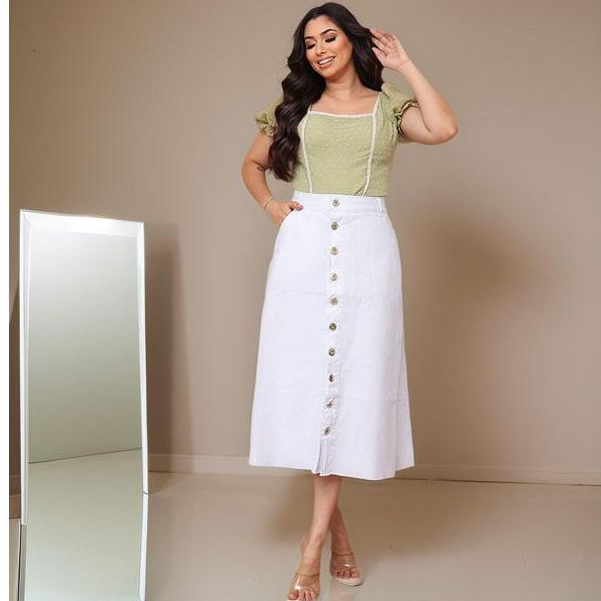 Saia Jeans Longa Branca Toda Lisa Com Botões e Bolsos 100% Jeans Luxo Moda Evangélica