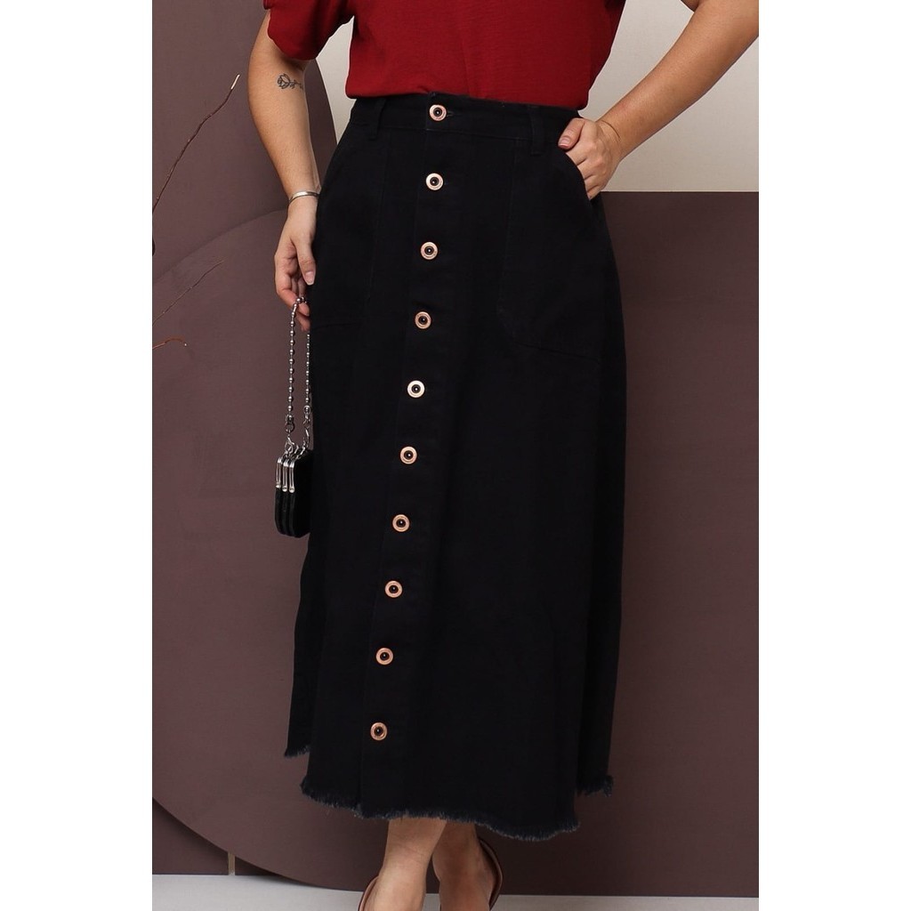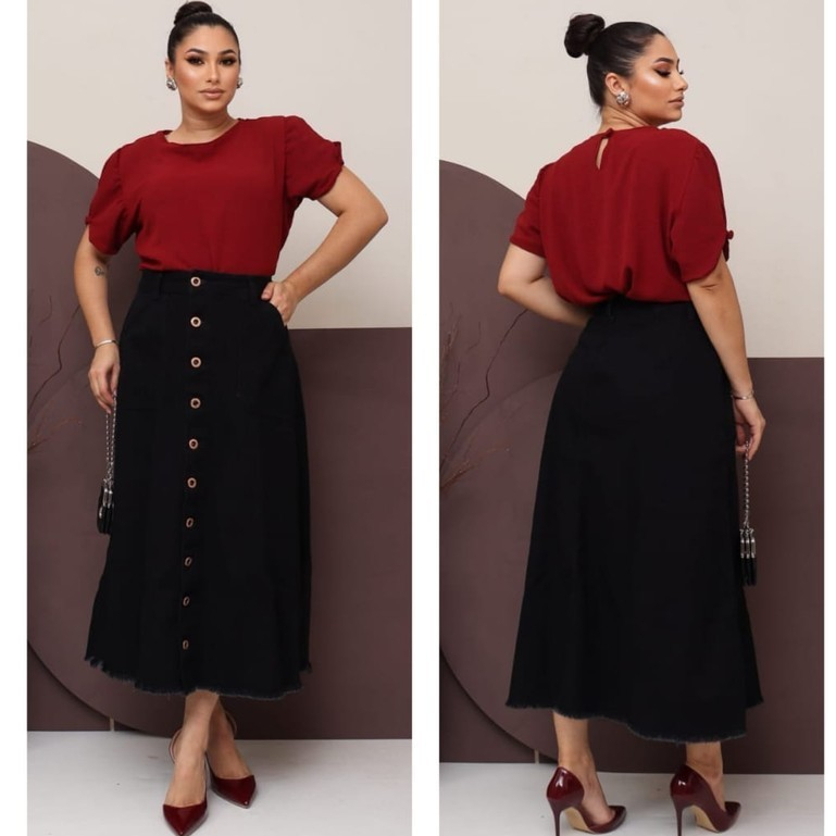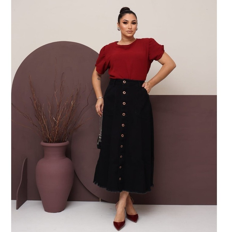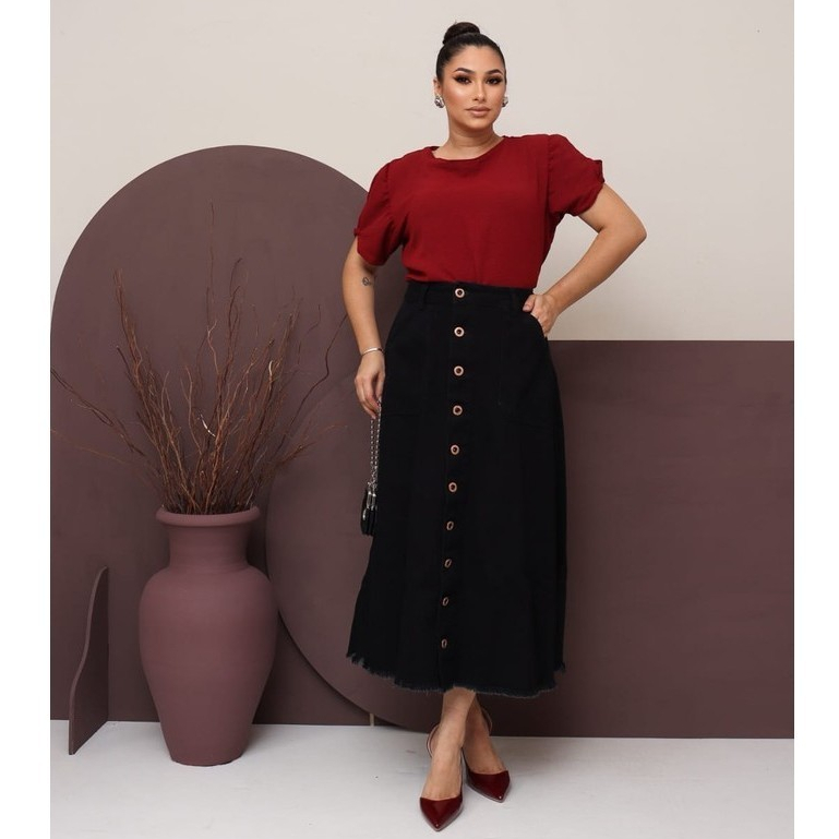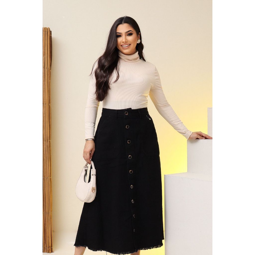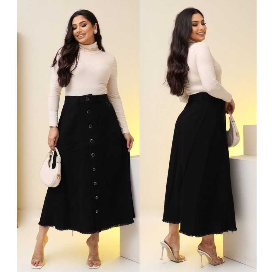Saia Jeans Longa Preta Toda Lisa Com Botões e Bolsos Moda Evangélica 100% Jeans Luxo