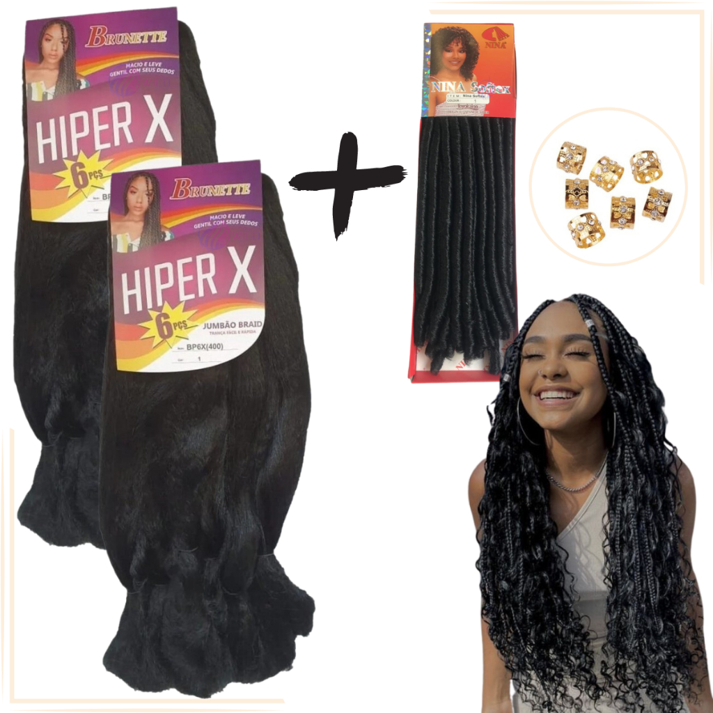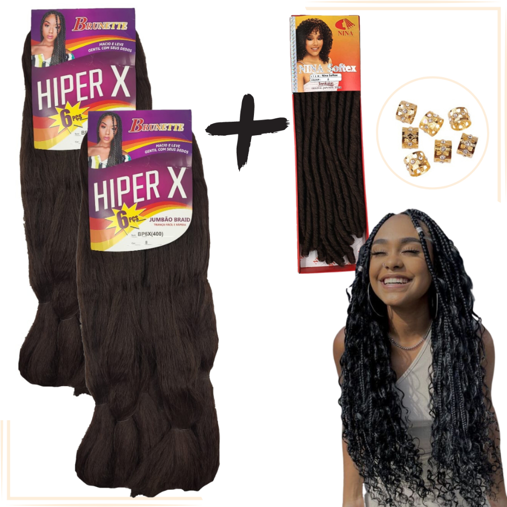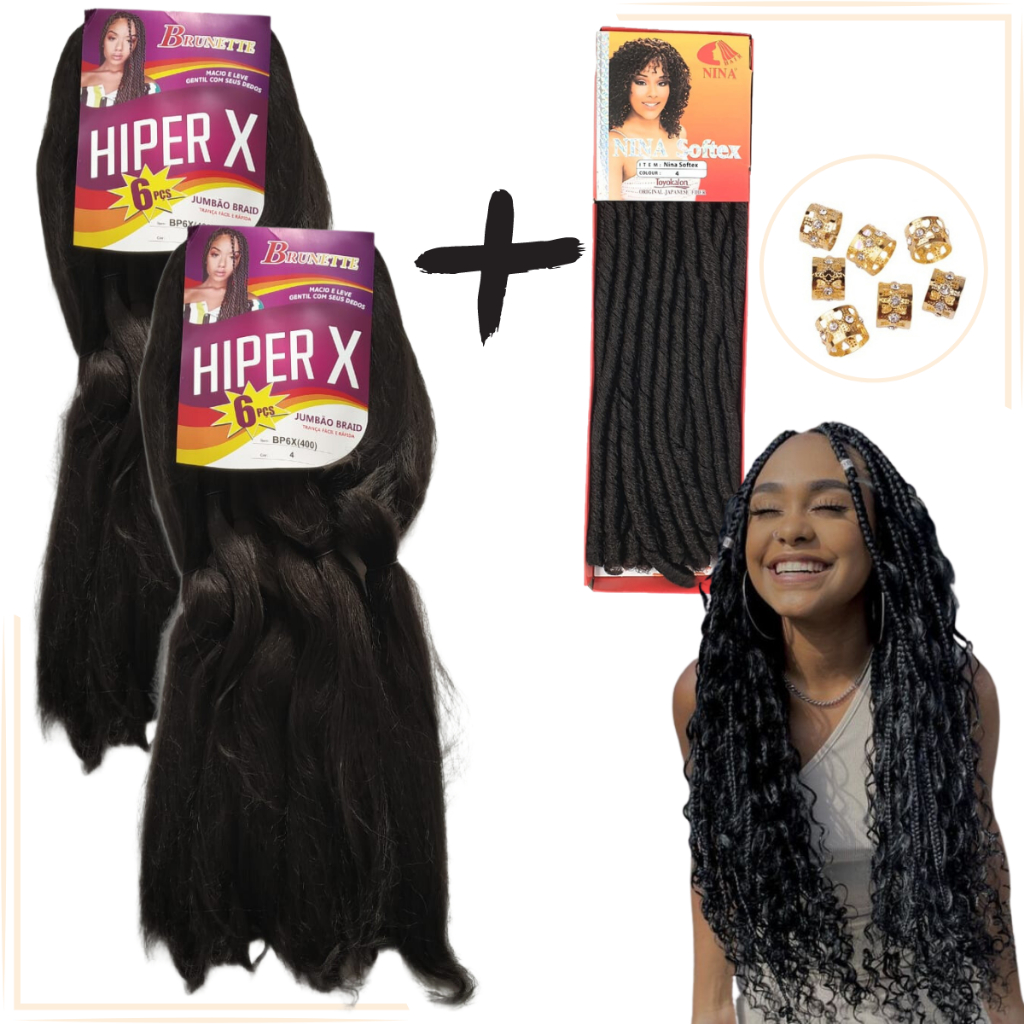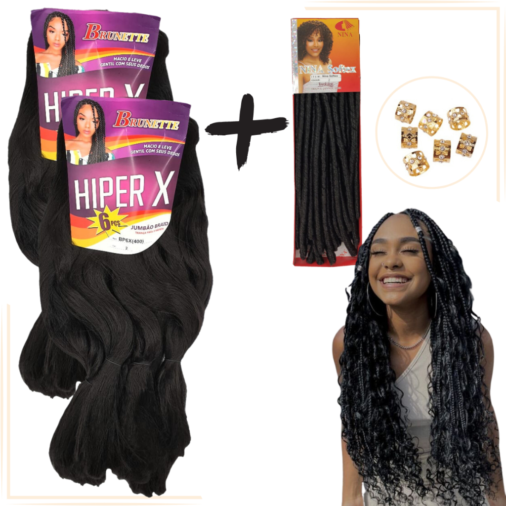 Kit 2 Cabelo Jumbo Gypsy Braids Hiper X Tranças Box Braid + Nina Softex Crochet Braids + Anéis de Enfeite