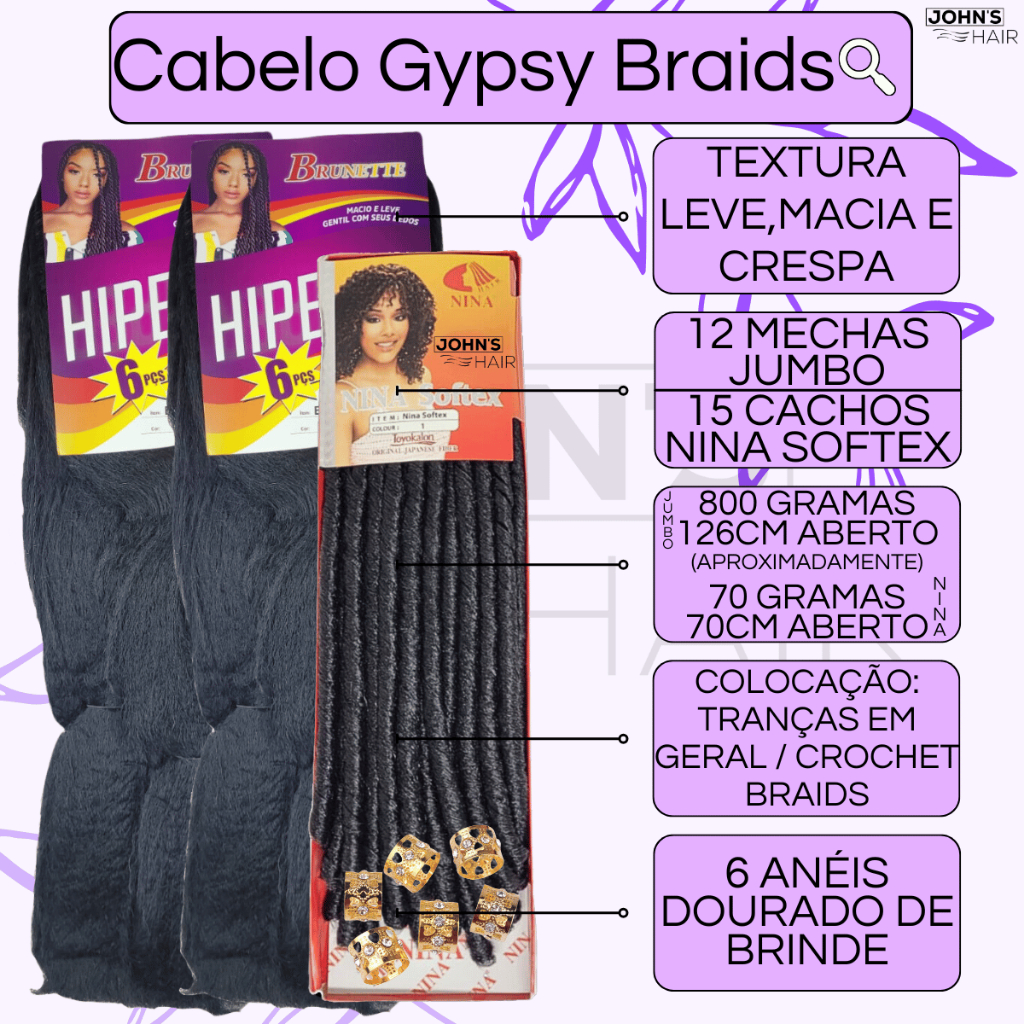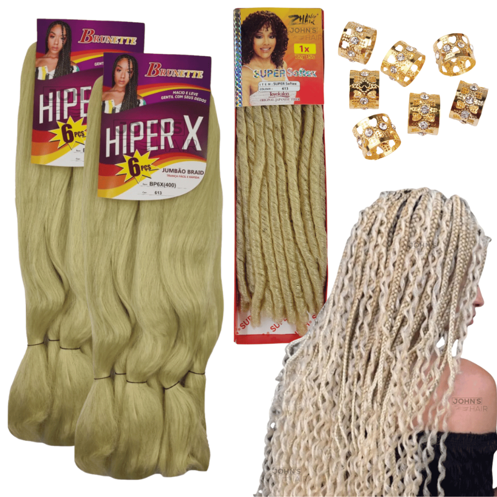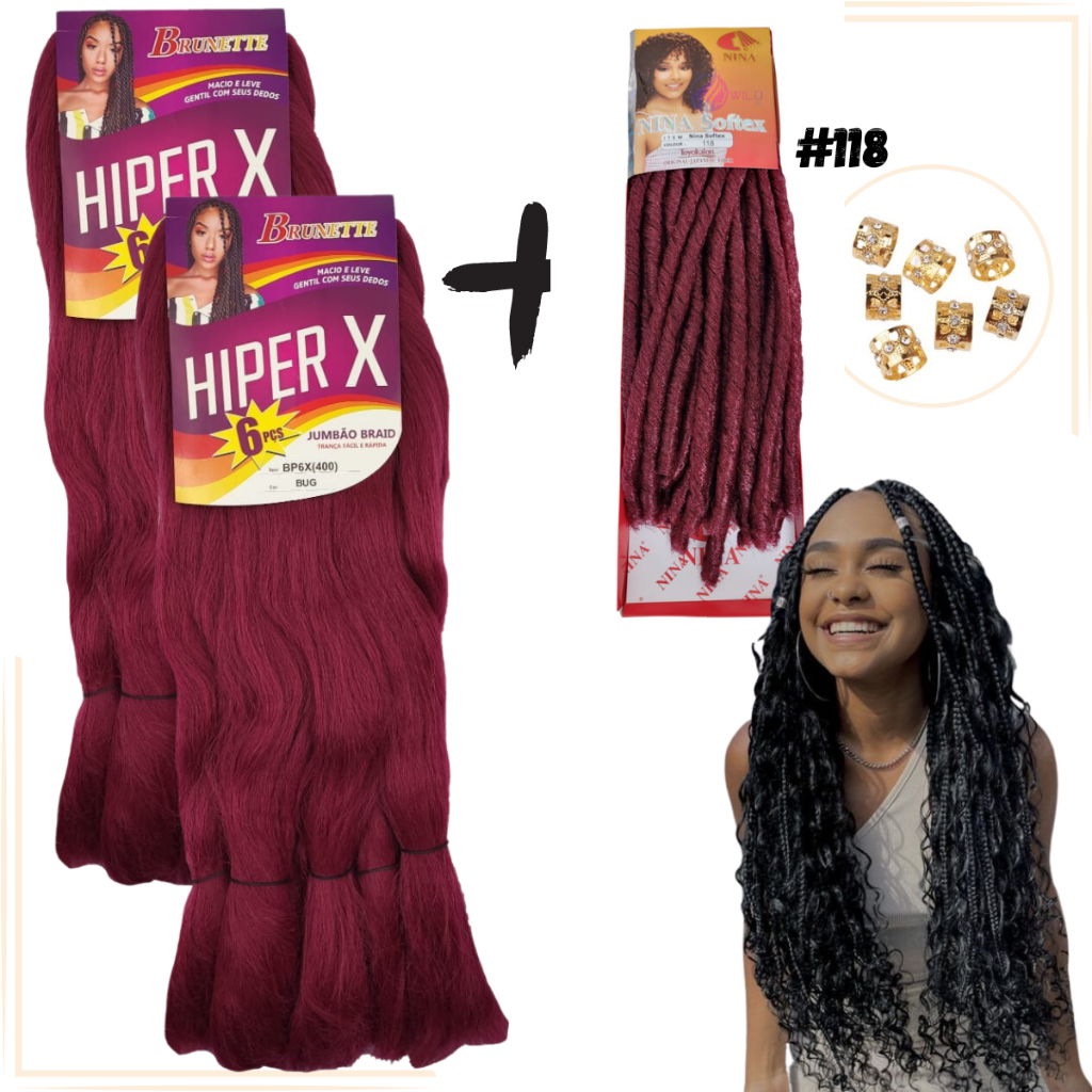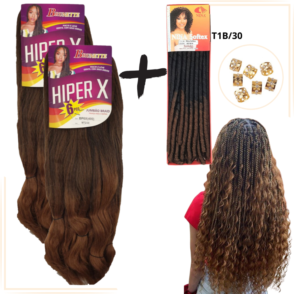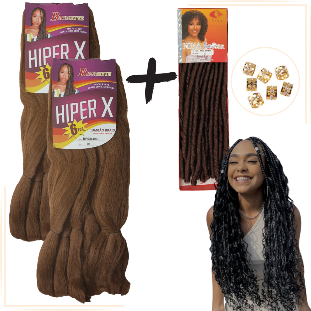 Kit 2 Cabelo Jumbo Gypsy Braids Hiper X Tranças Box Braid + Nina Softex Crochet Braids + Anéis de Enfeite