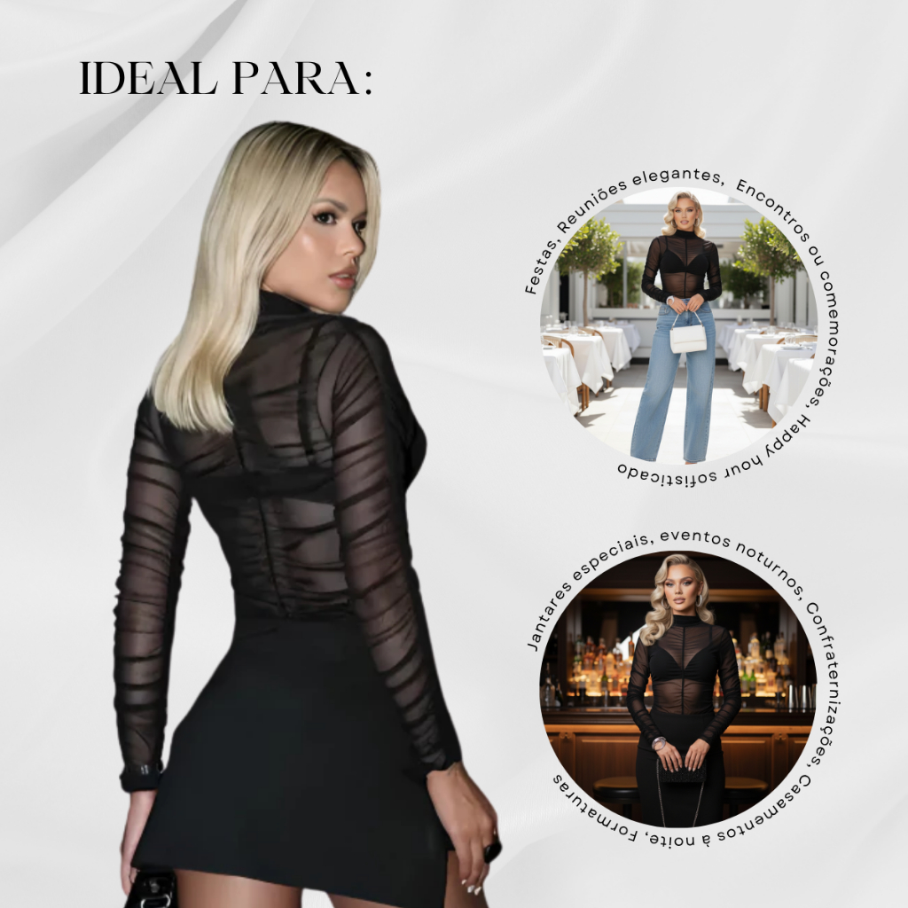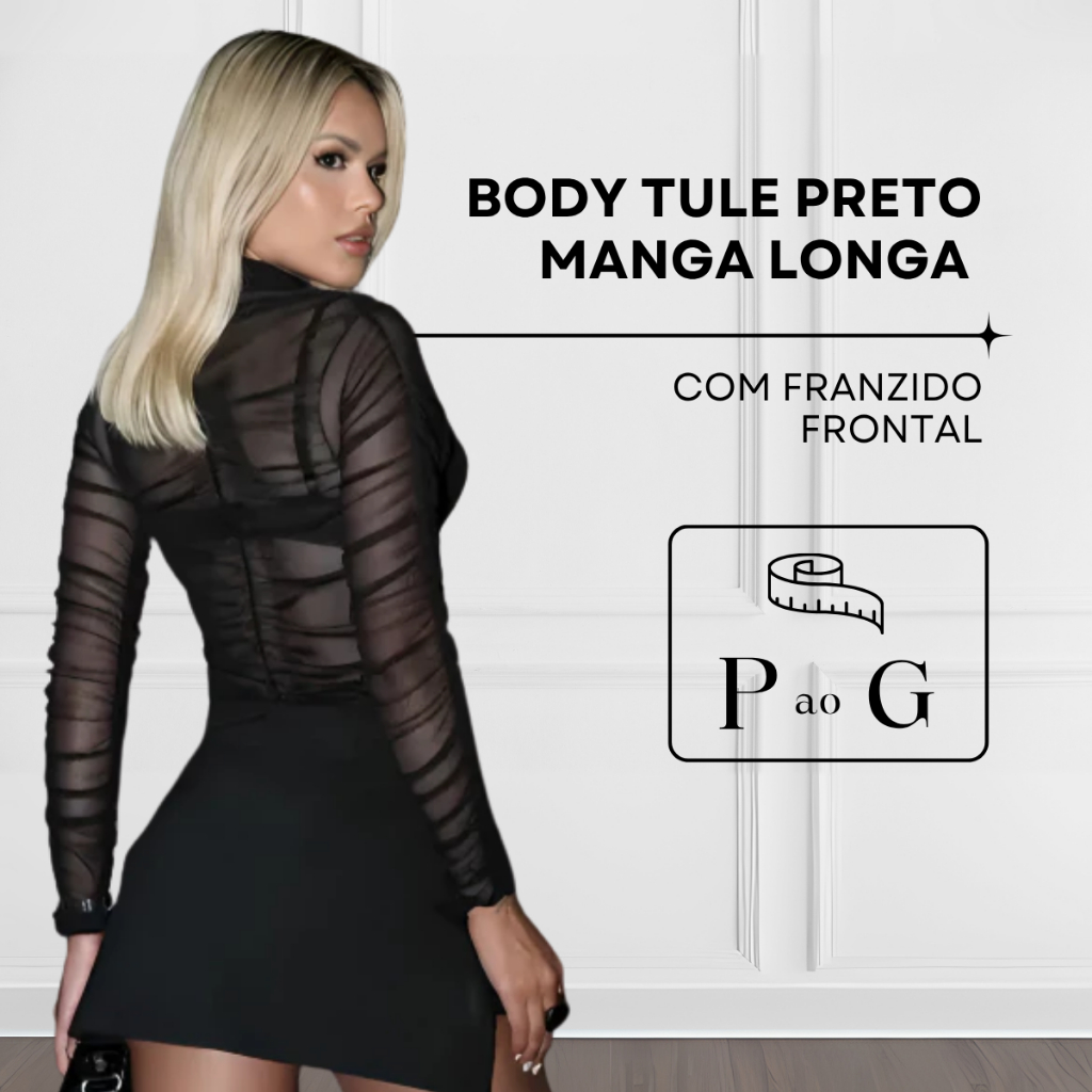 Body Tule Preto Manga Longa com Franzido