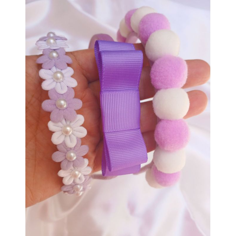 kit 3 Lindas Tiaras Lilás e Branco Com Pompons Florzinhas e Meia Pérola kit 3 Unidades Arquinho Acessório Infantil