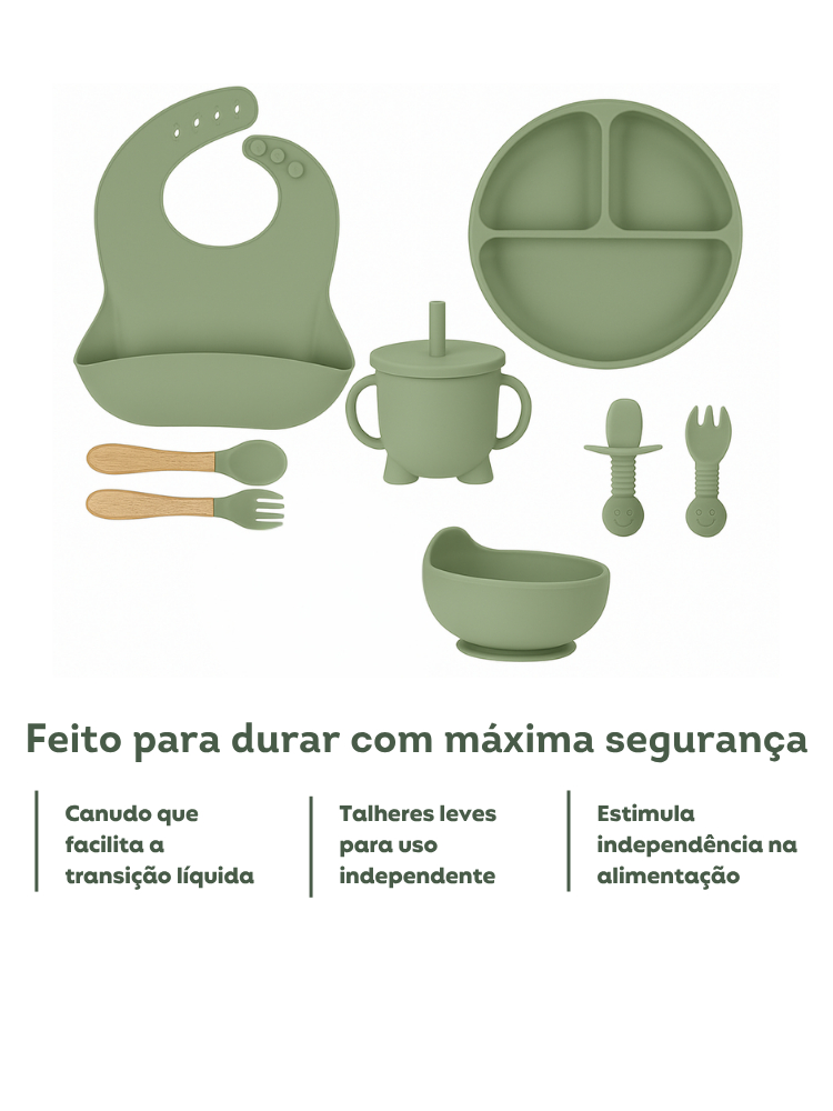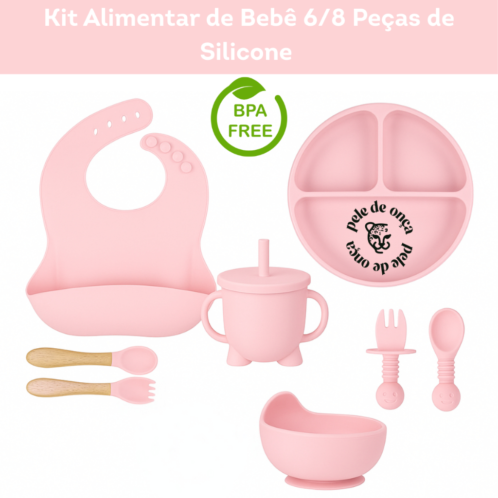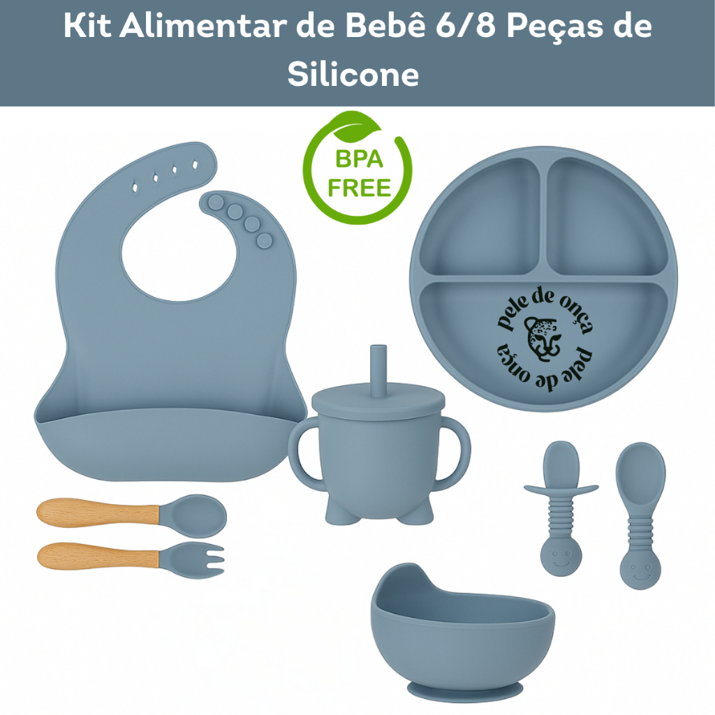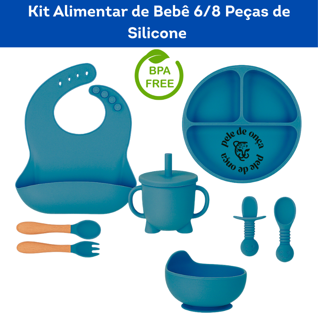 Kit 6/8 Peças Introdução Alimentar Silicone Bebê Talheres Babador Prato Ventosa Colher Garfo