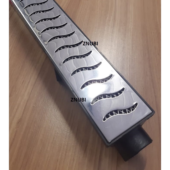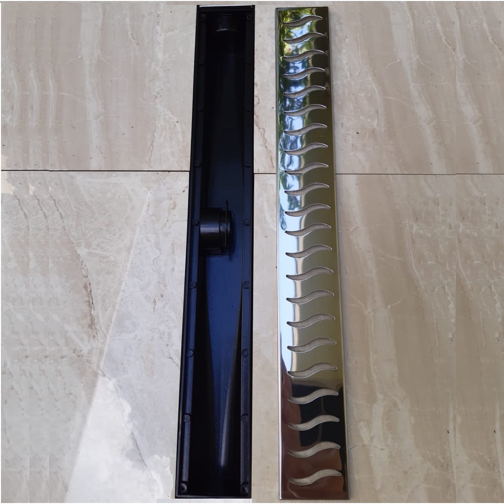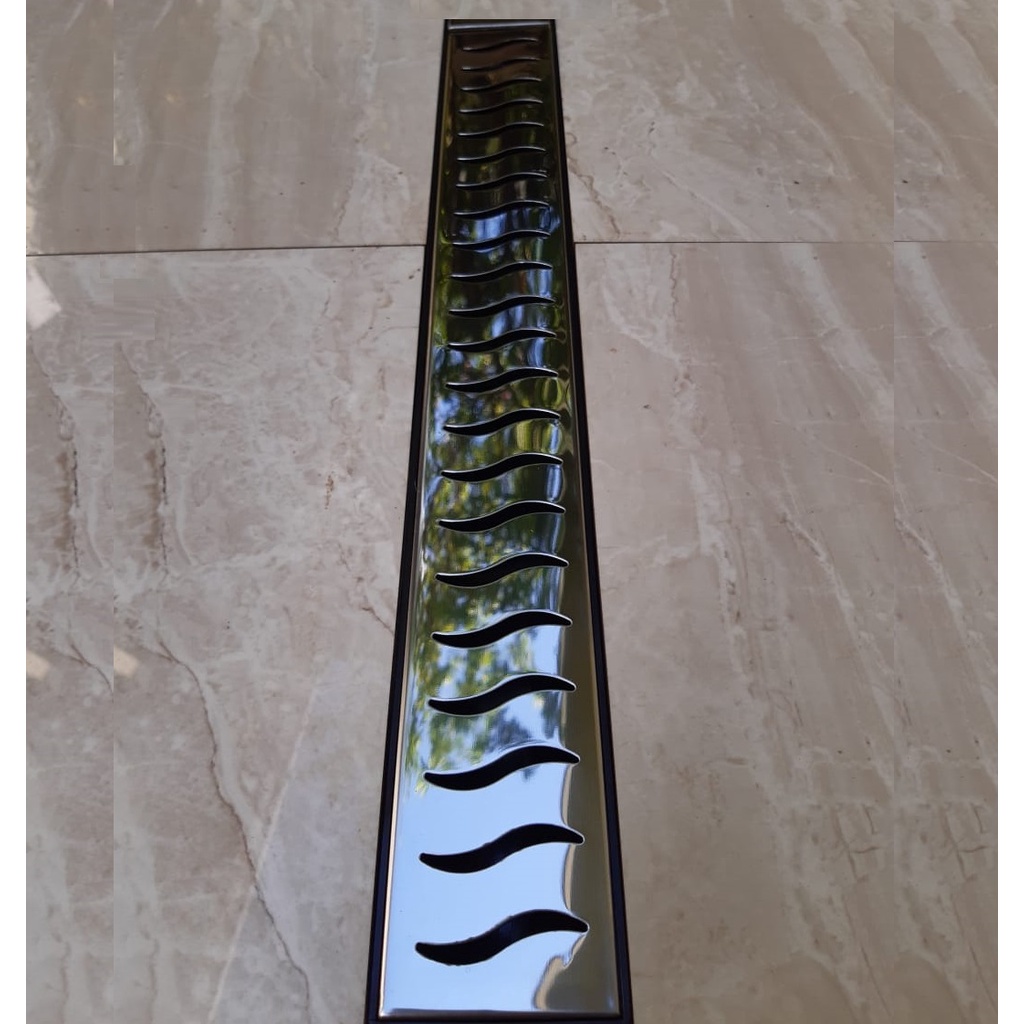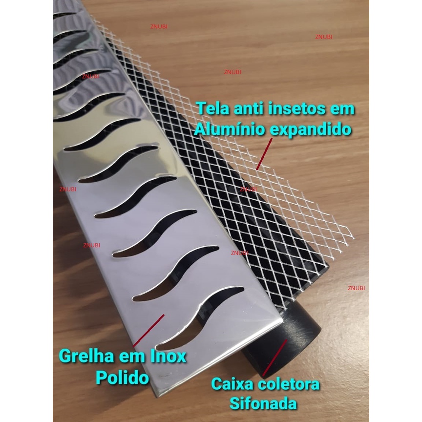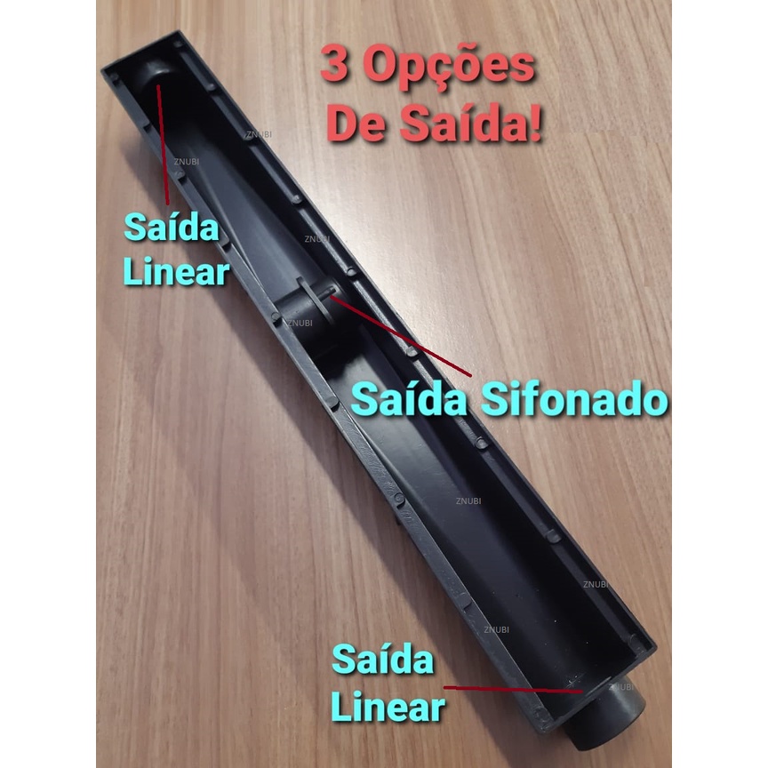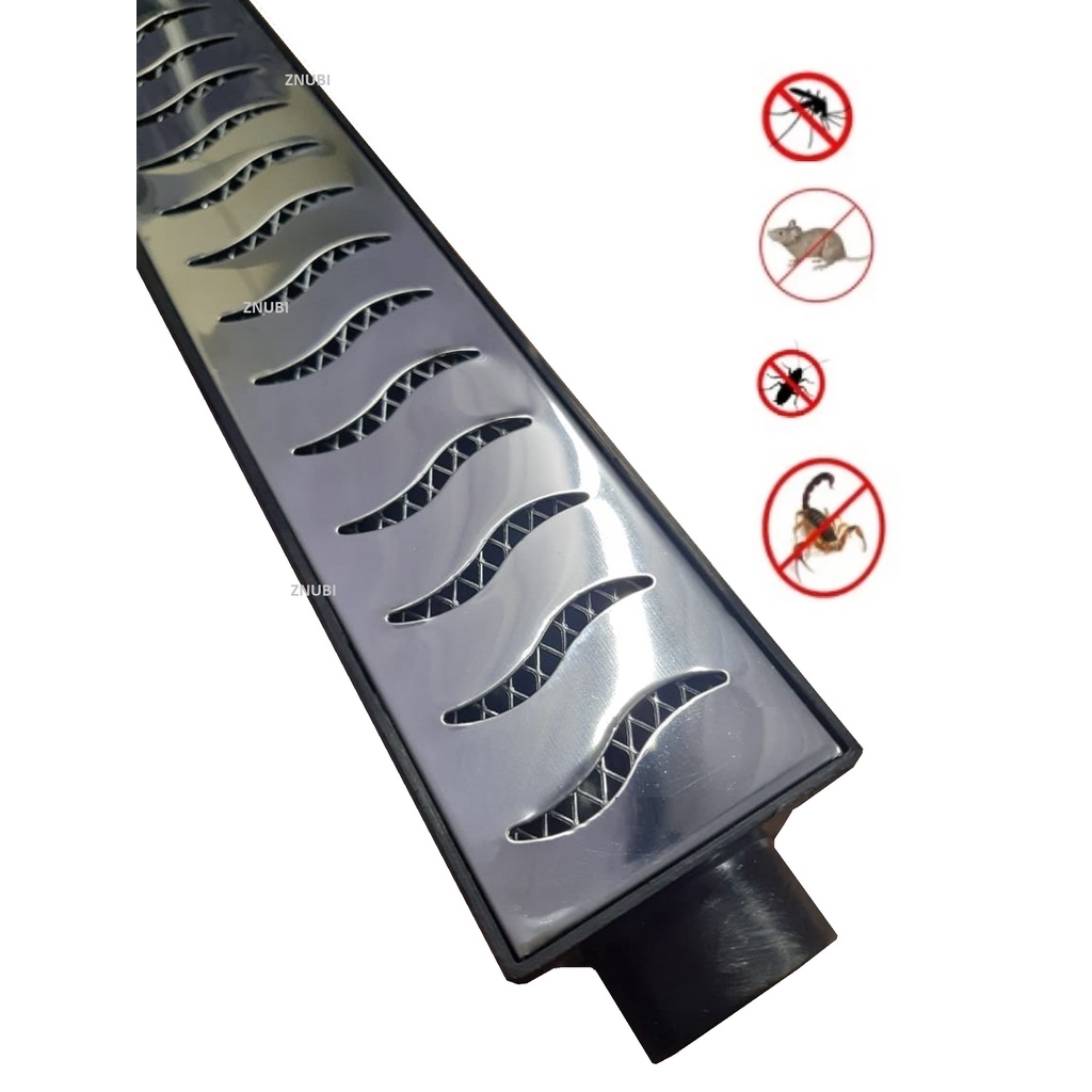 Ralo Linear 6x50cm Sifonado com Caixa Coletora Preta, Tela Anti Insetos e Grelha Aberta Em Aço Inox Polido
