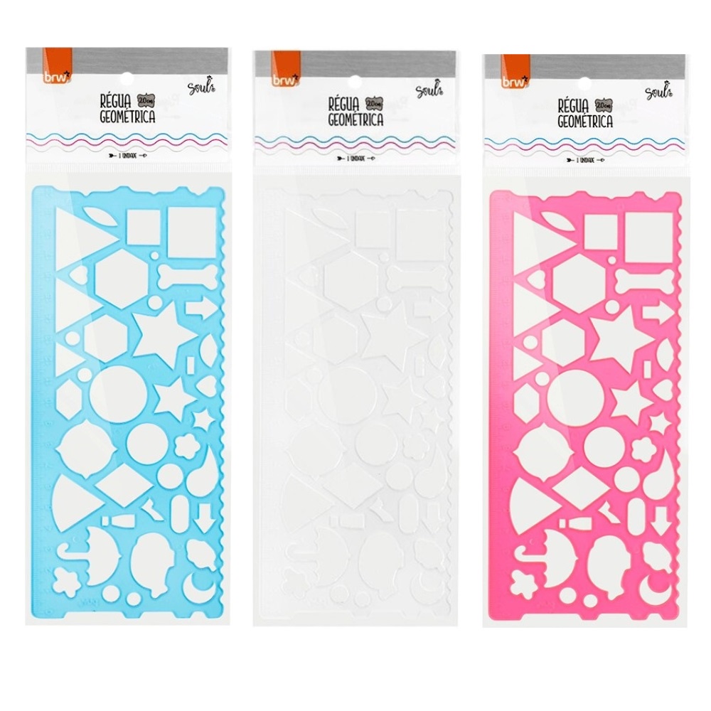 Régua Formas Geométricas 20cm Colorida Transparente BRW | Desenhos Geométricos | Material Escolar | Réguas | Papelaria