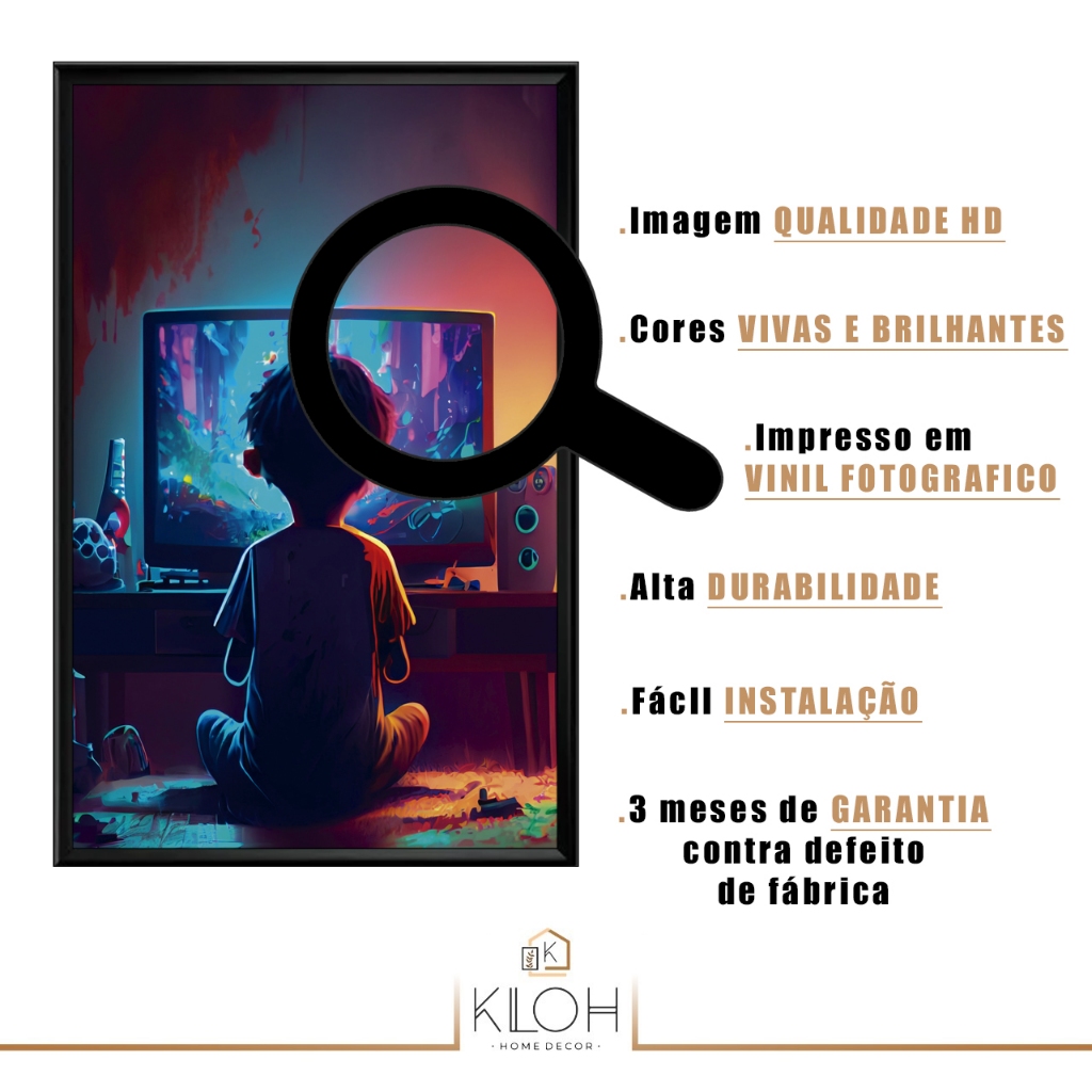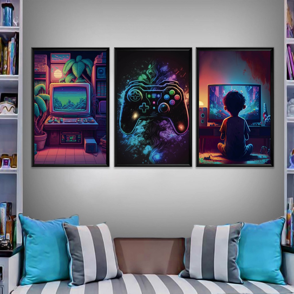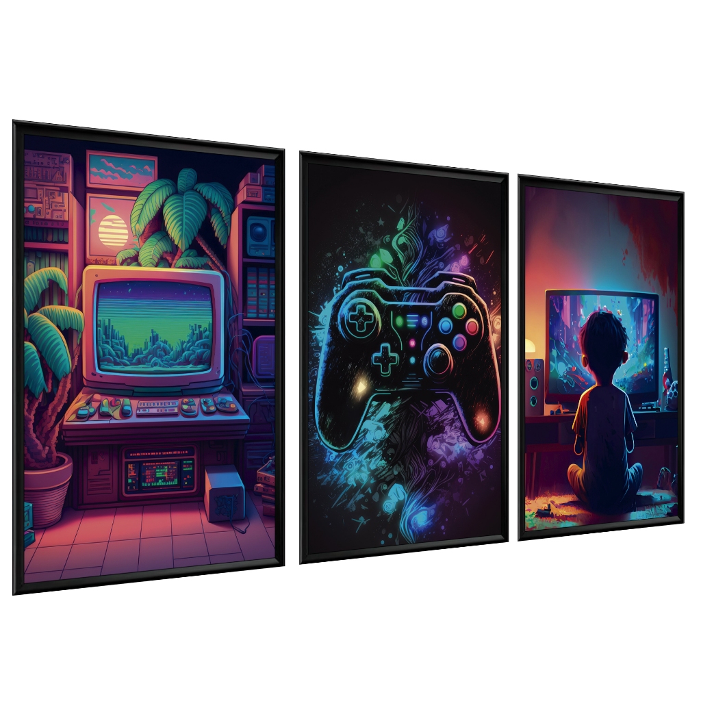 Quadros Decorativos Quarto Gamer Jogos Geek Video Games Setup Moldura Grande 63x43 3 peças