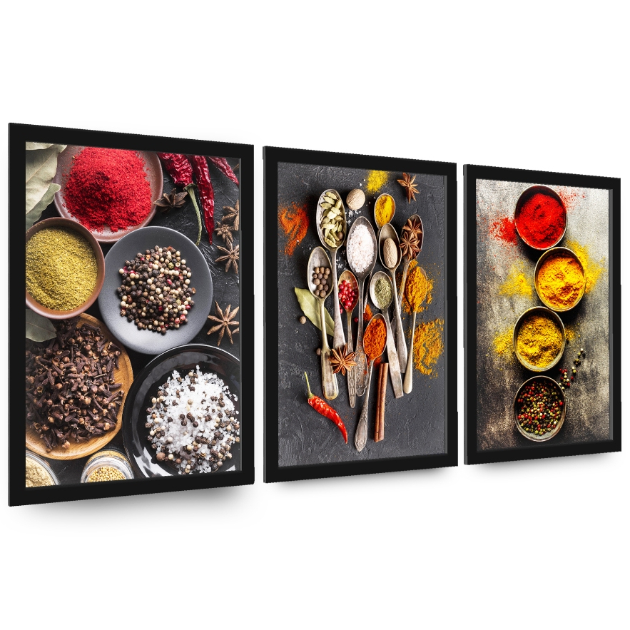 Kit 3 Quadros Cozinha Temperos Gourmet Moldura 63x43 Grande Decoração Restaurante Mosaico
