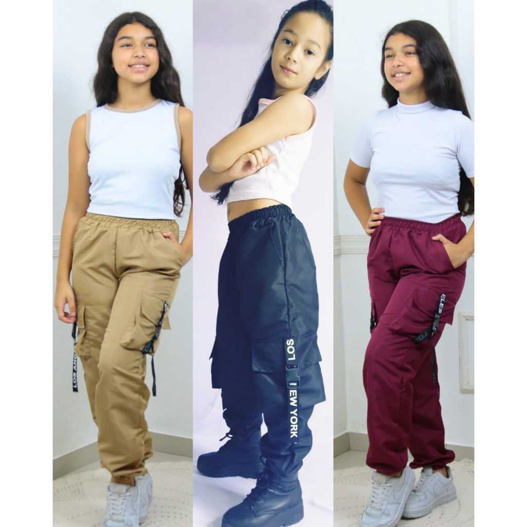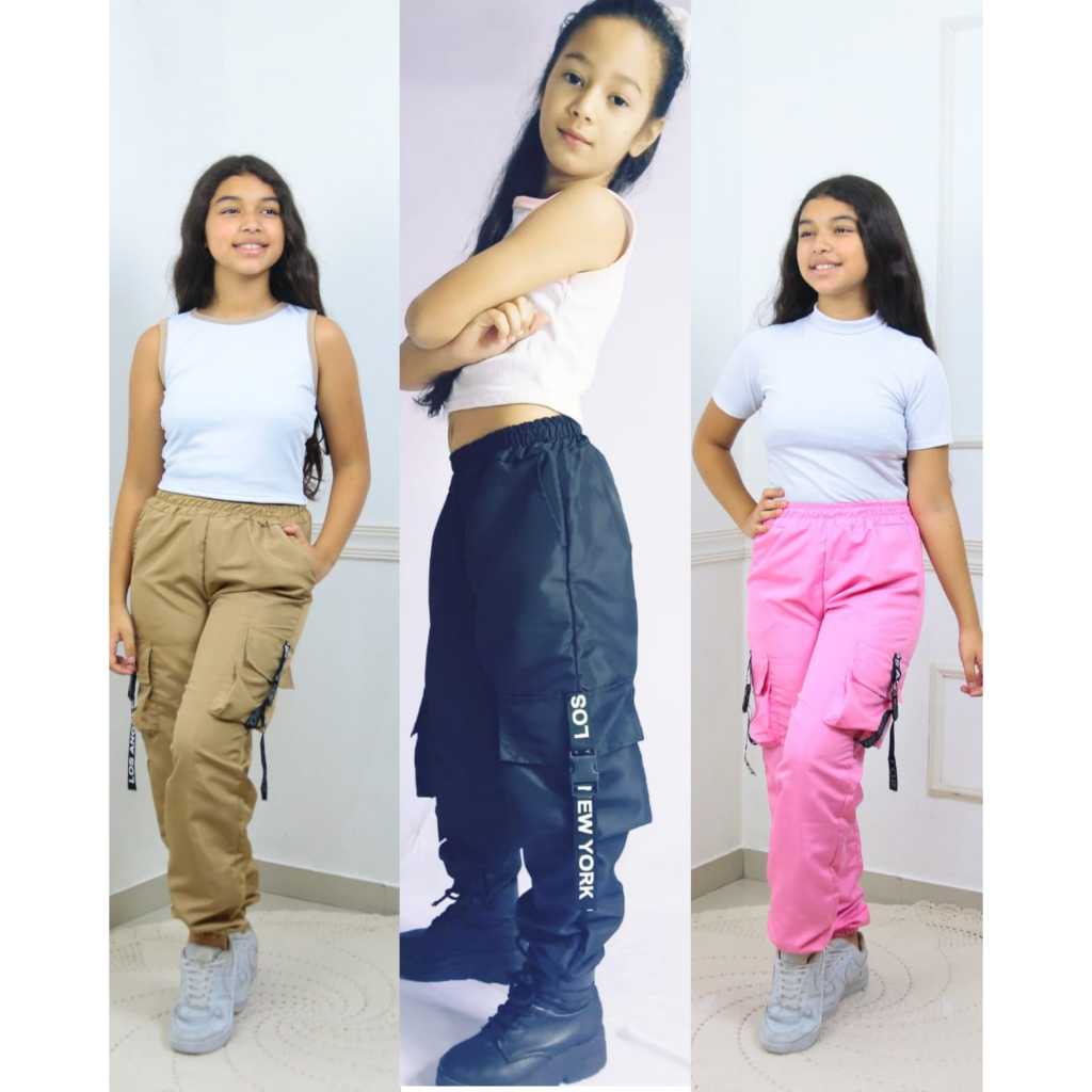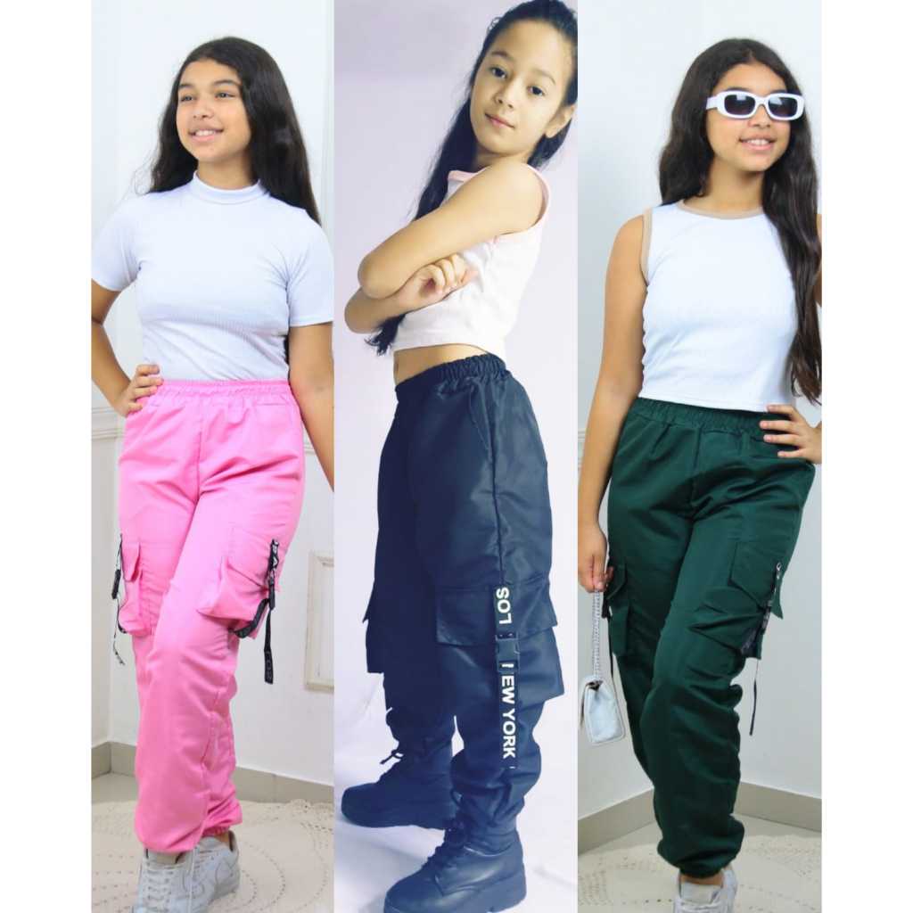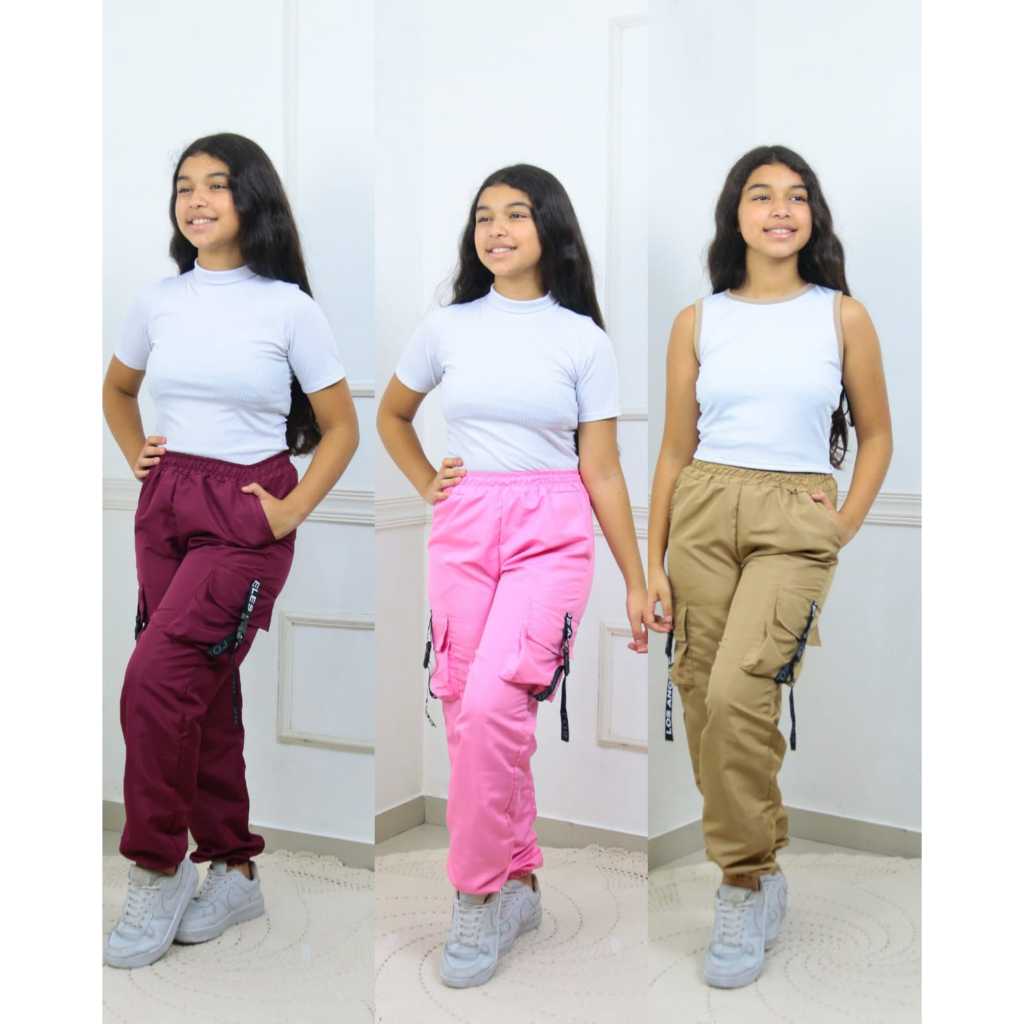 Kit 3 Calças Tactel com 4 Bolsos – Tamanhos 6 ao 16 | Preto Lilás Bege Rosa Vinho Verde