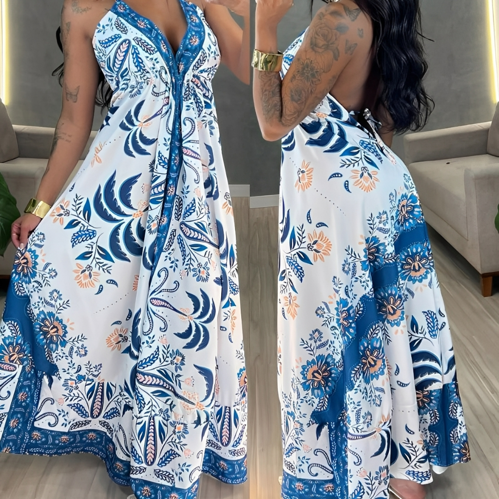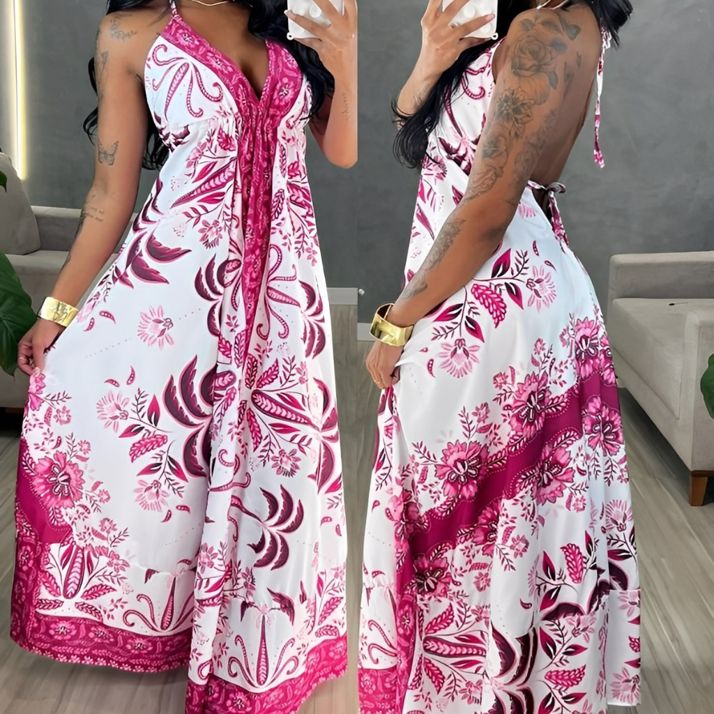 Vestido Longo Estampado Boho Decote Profundo com Amarração nas Costas