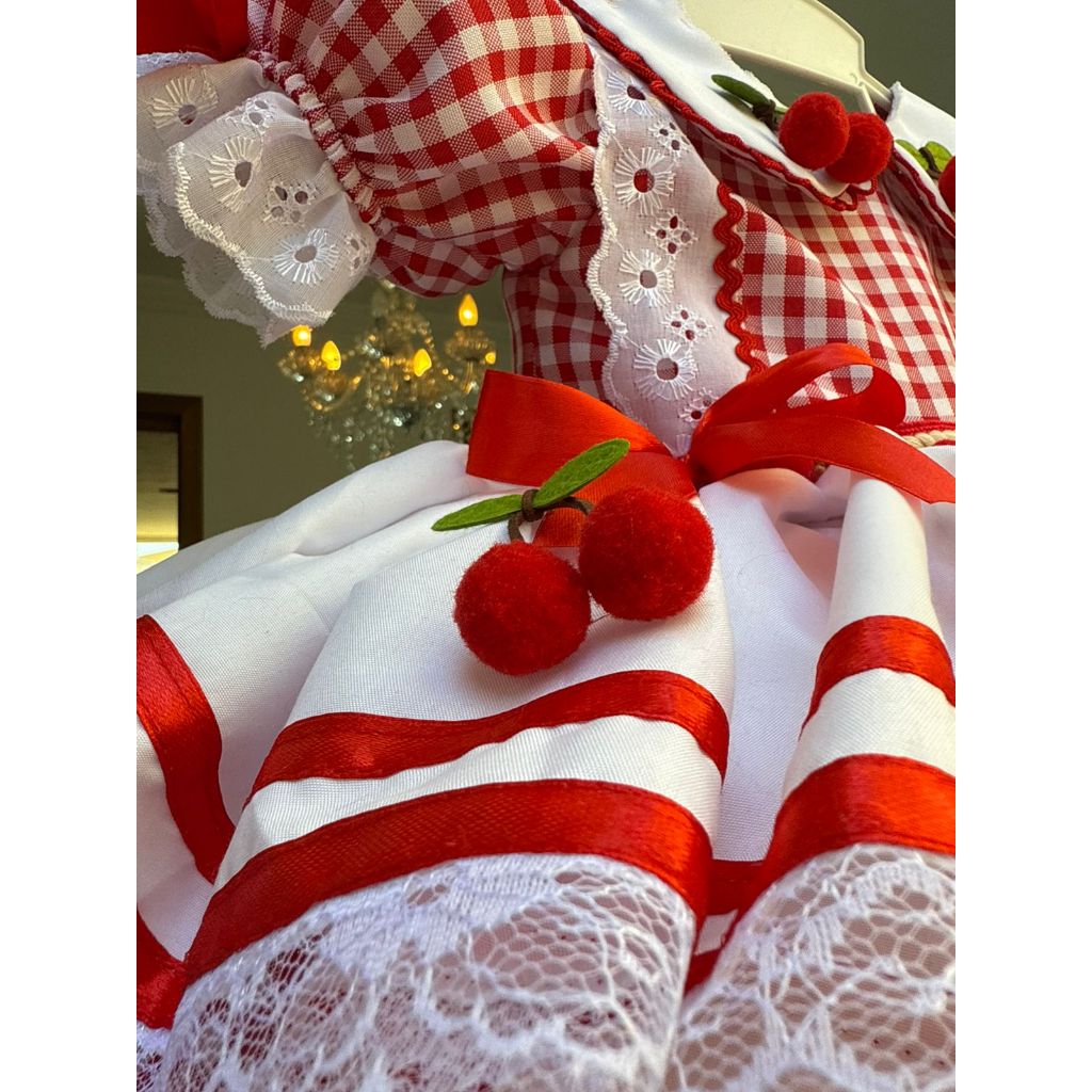 Vestido Junino Torta de Cereja 2026 Luxo Festa Junina Xadrez Cereja Vermelho Quadrilha