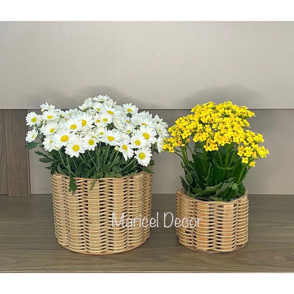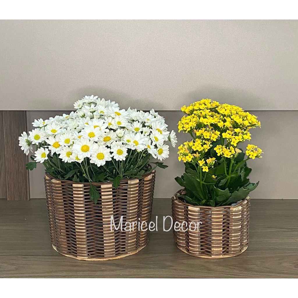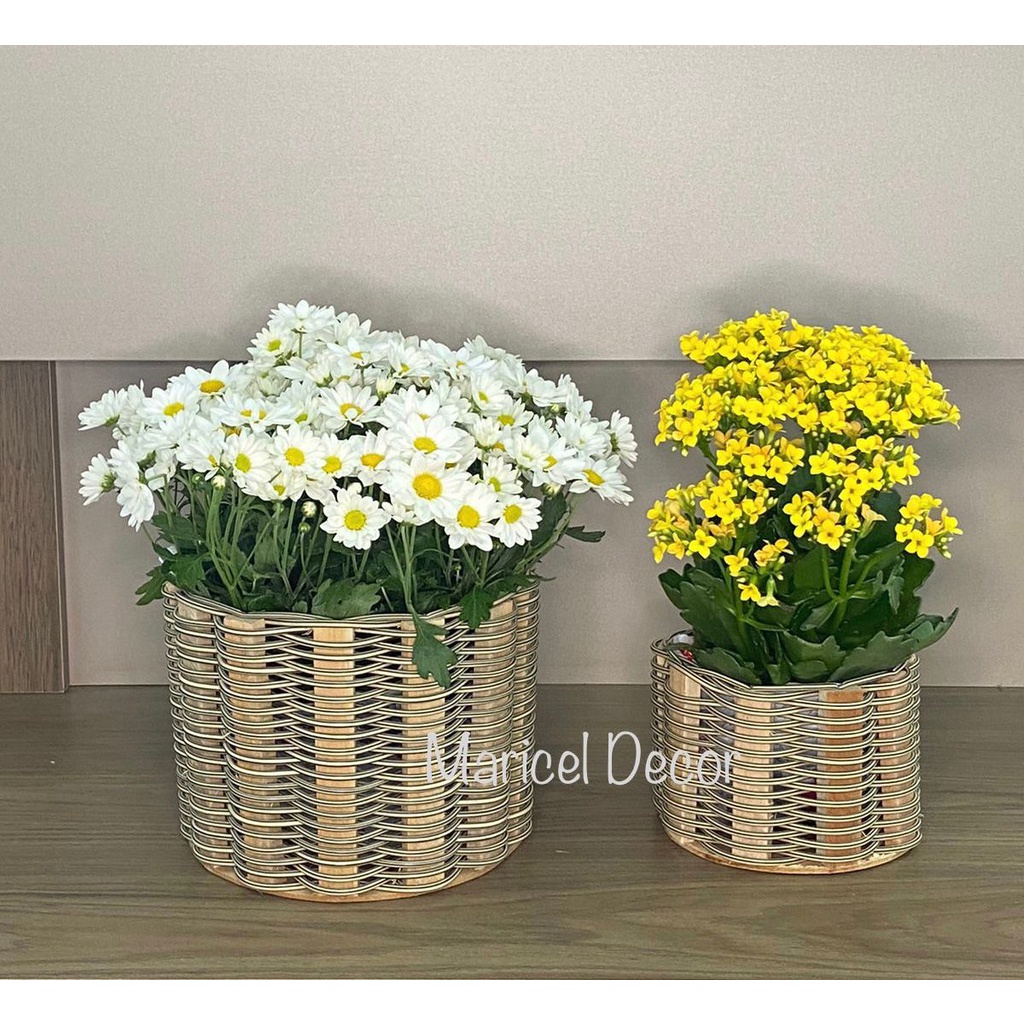 kit 2pçs Vaso Cachepô 20x15cm e 11x11cm Crisântemo e Violeta Redonda de Fio