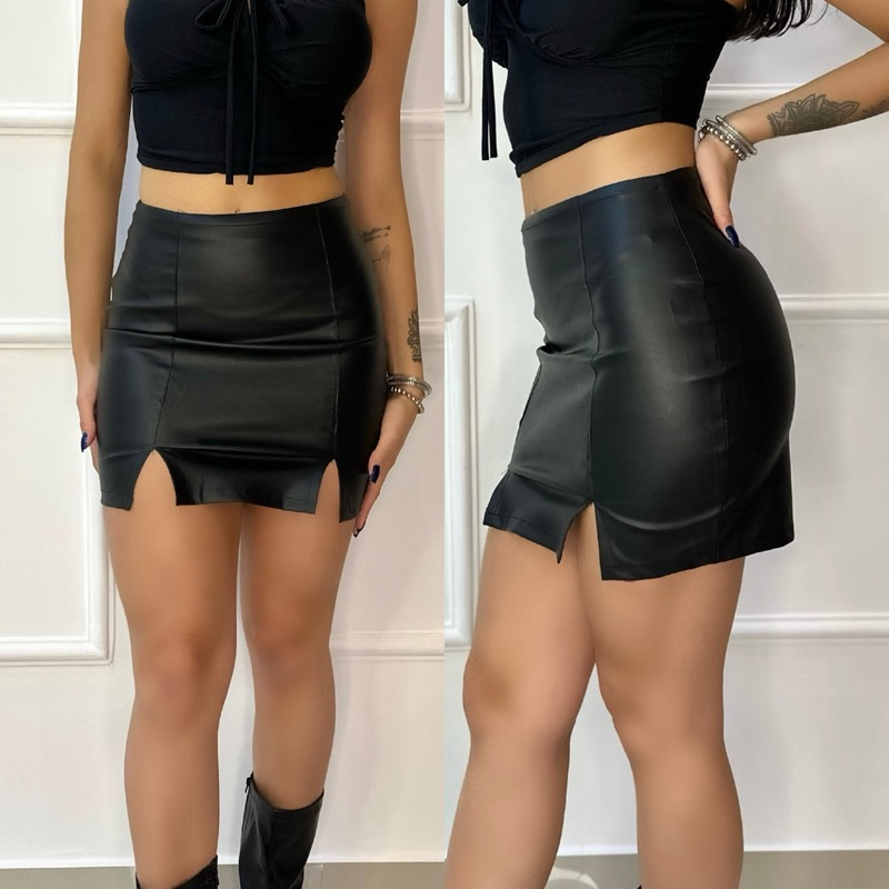 Saia Couro ziper Preto cintura alta entrega imediata fendas frontral zíper nas costas