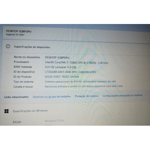 Notebook Dell Intel I7 2.90ghz Tela15' 3567 12gb 480gb Win11