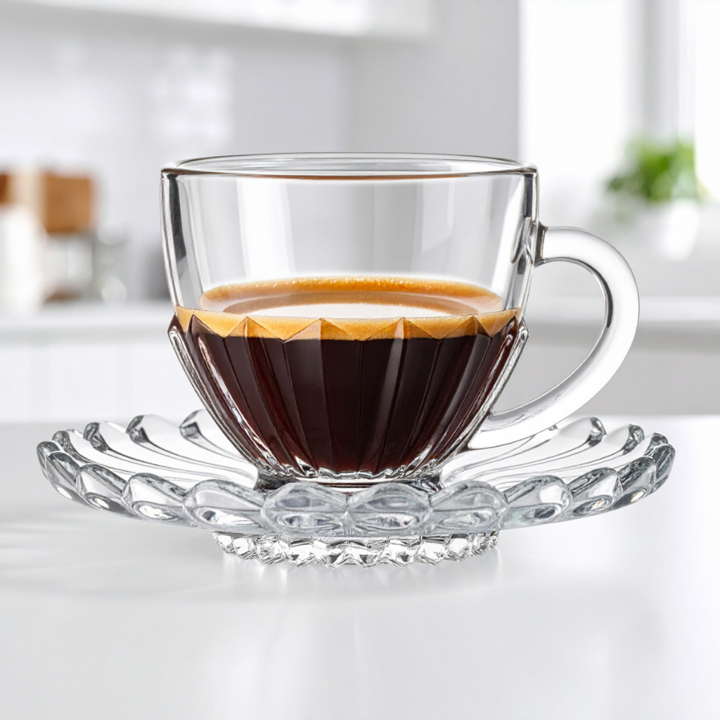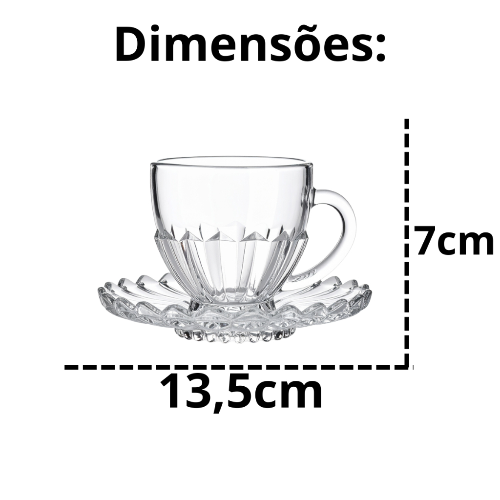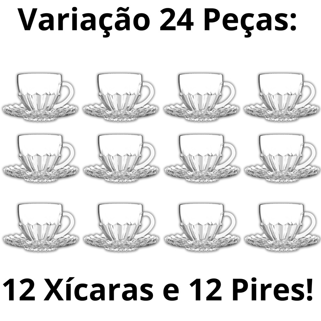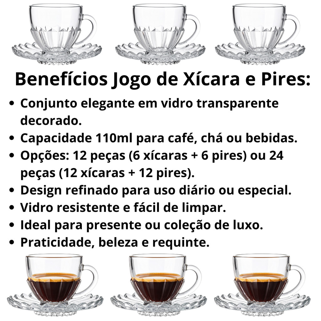 Jogo de 6 ou 12 Xícaras com Pires Cafe e Cha Brasiliano Transparente Vidro 110ml Decorada Luxo