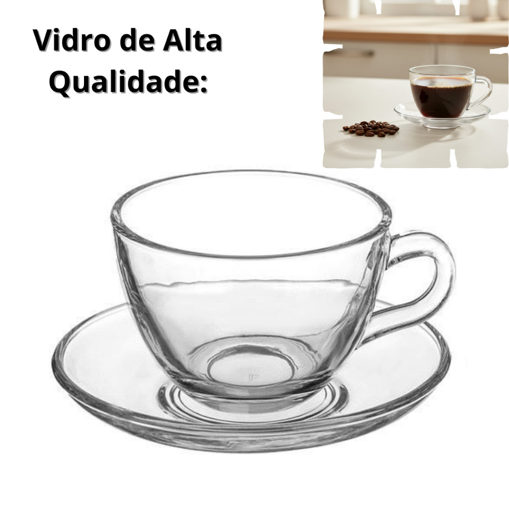 Jogo Xícaras Café Com Pires Chá 12 Peças Vidro Incolor 90ml Para Café Expresso