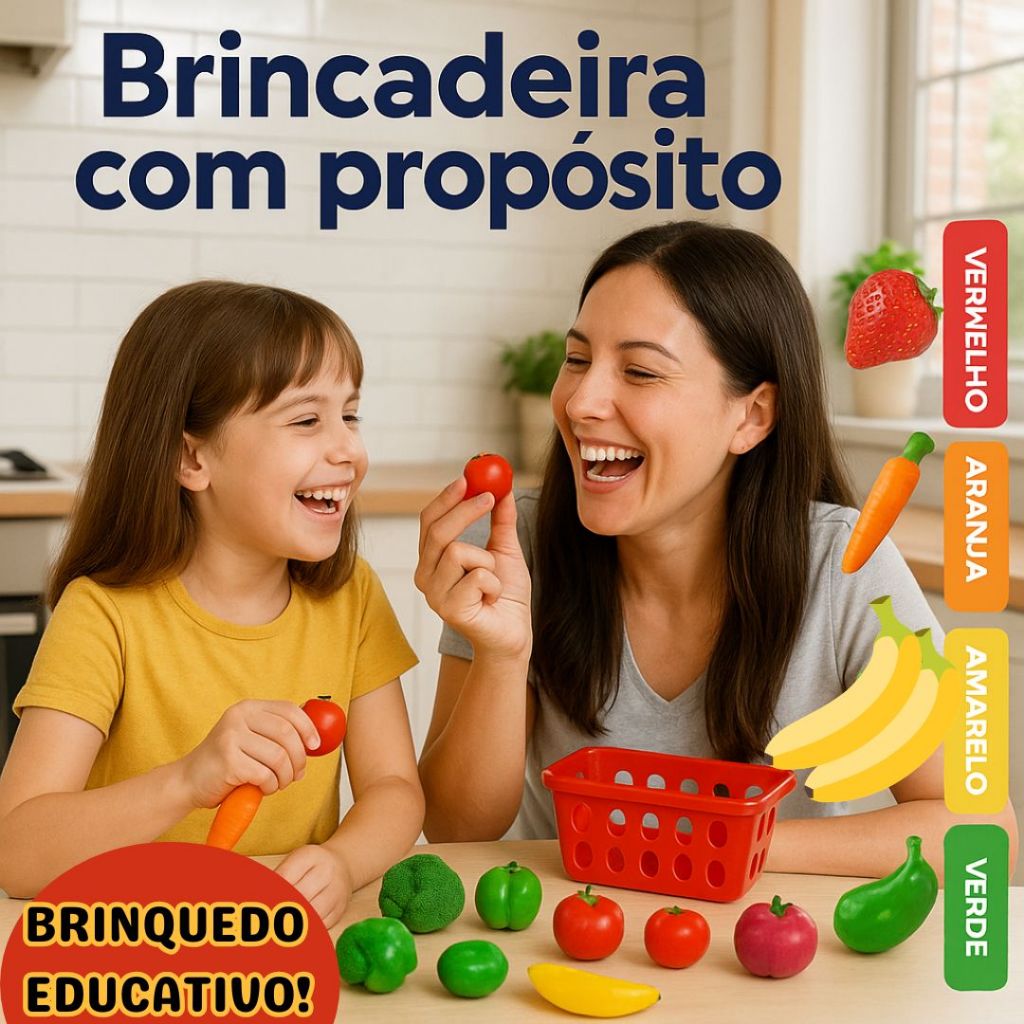 Kit Brinquedo Cozinha Infantil Frutas e Legumes de Corte com Velcr + Cestinha Educativo Presente