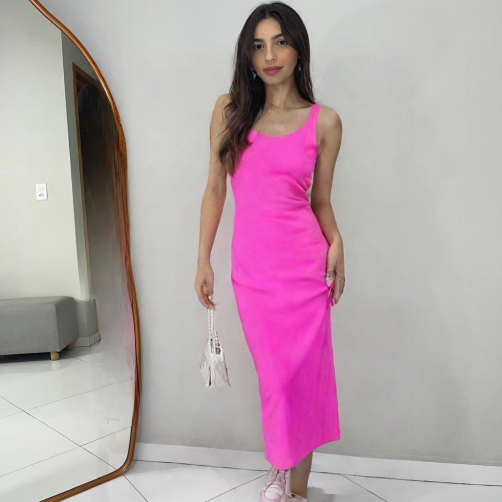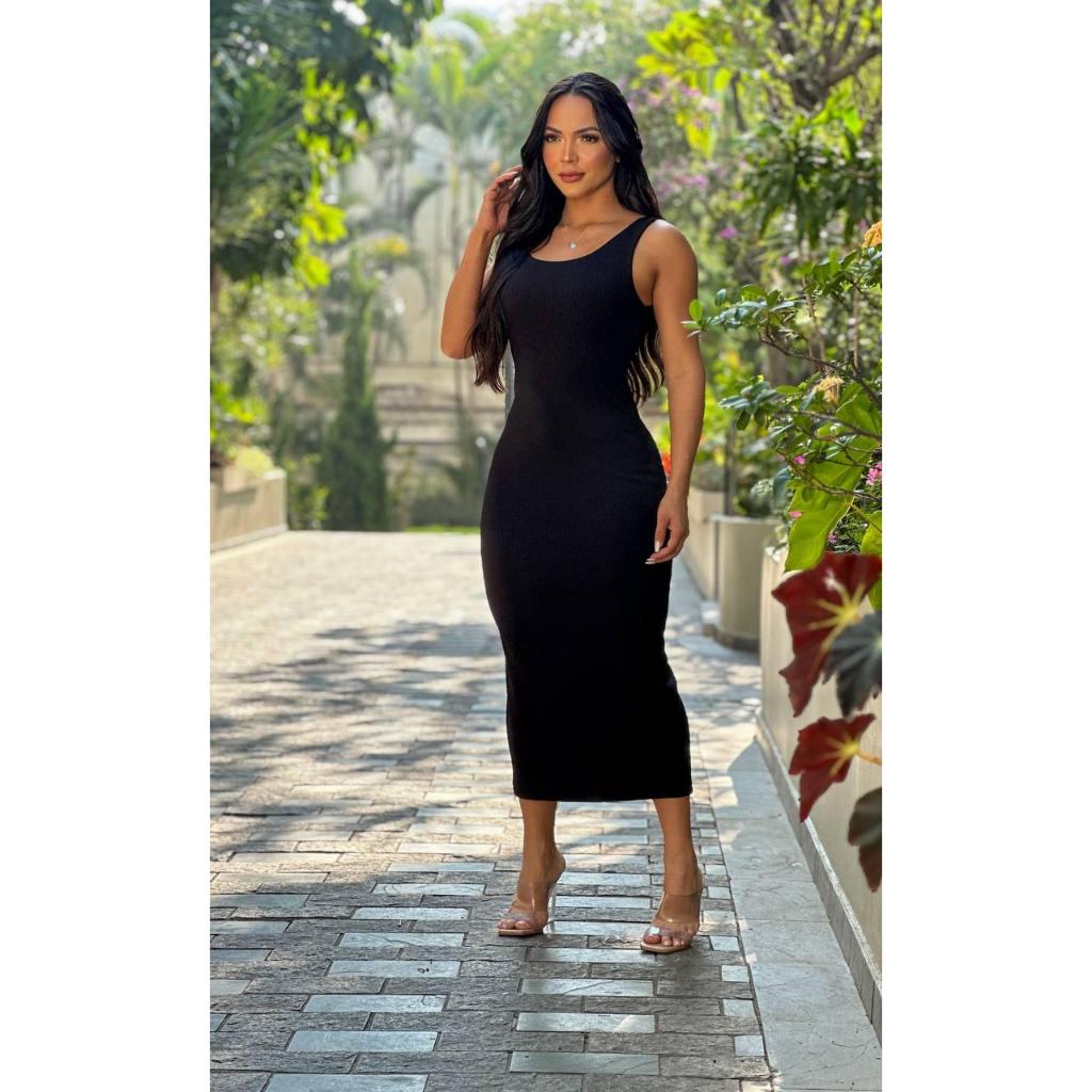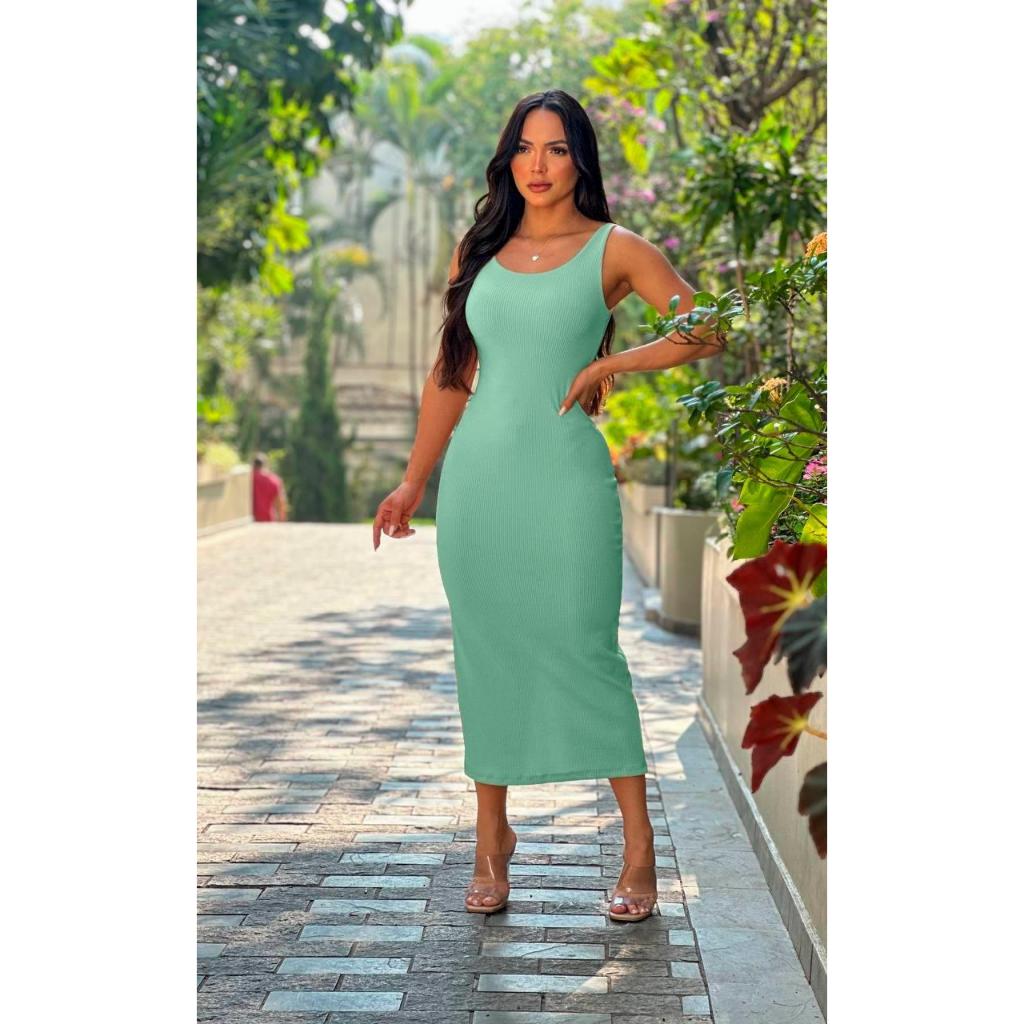 Vestido Feminino Colado Midi Alça Tubinho Canelado Decote Modinha Blogueira Tendência