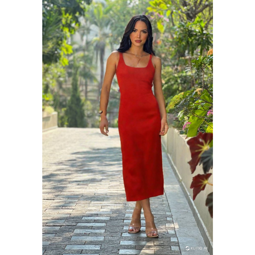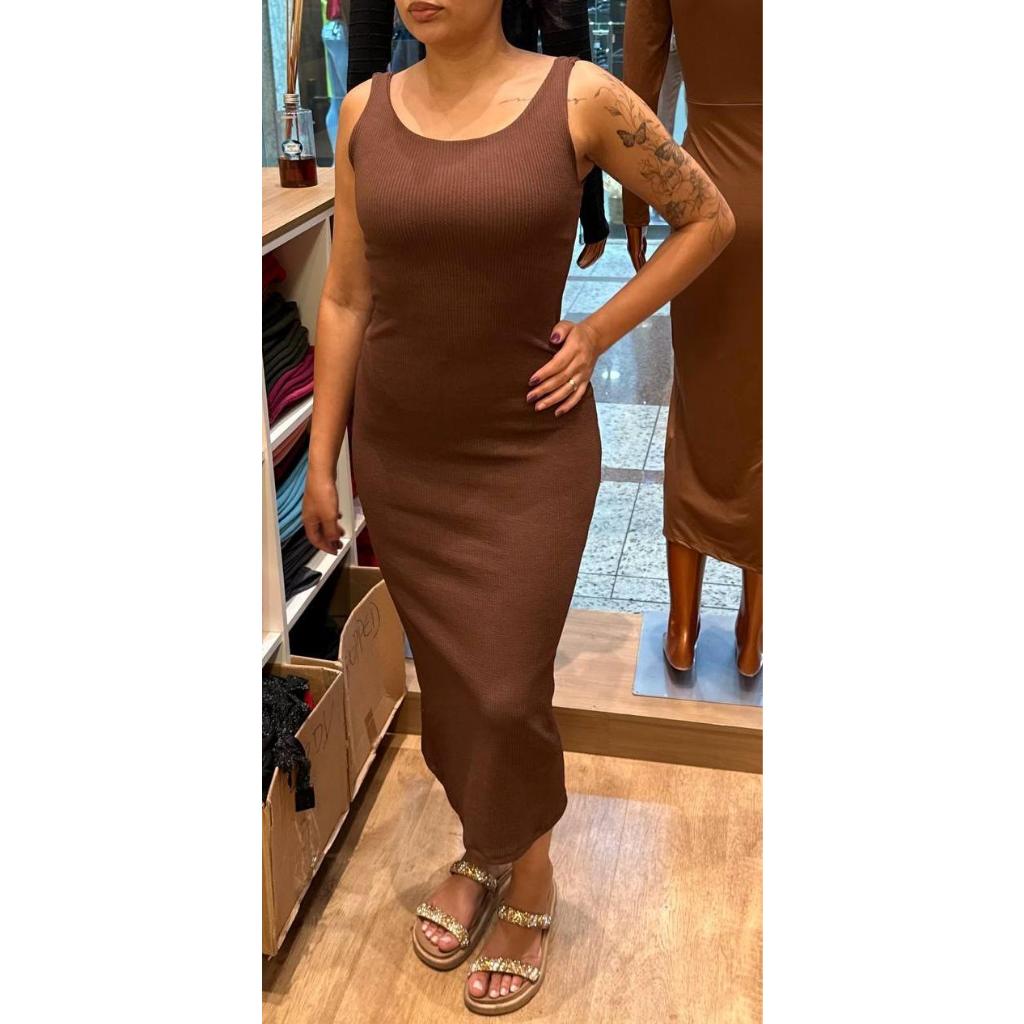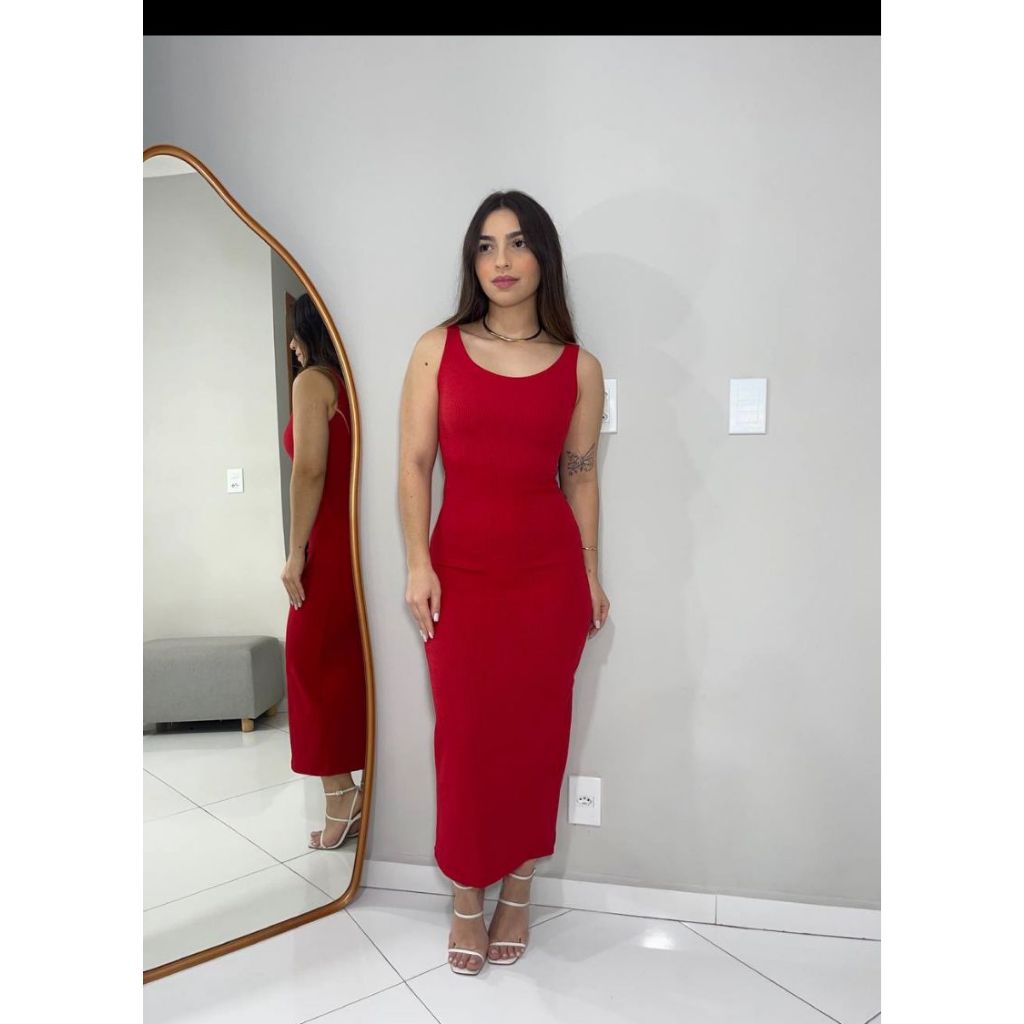 Vestido Feminino Colado Midi Alça Tubinho Canelado Decote Modinha Blogueira Tendência