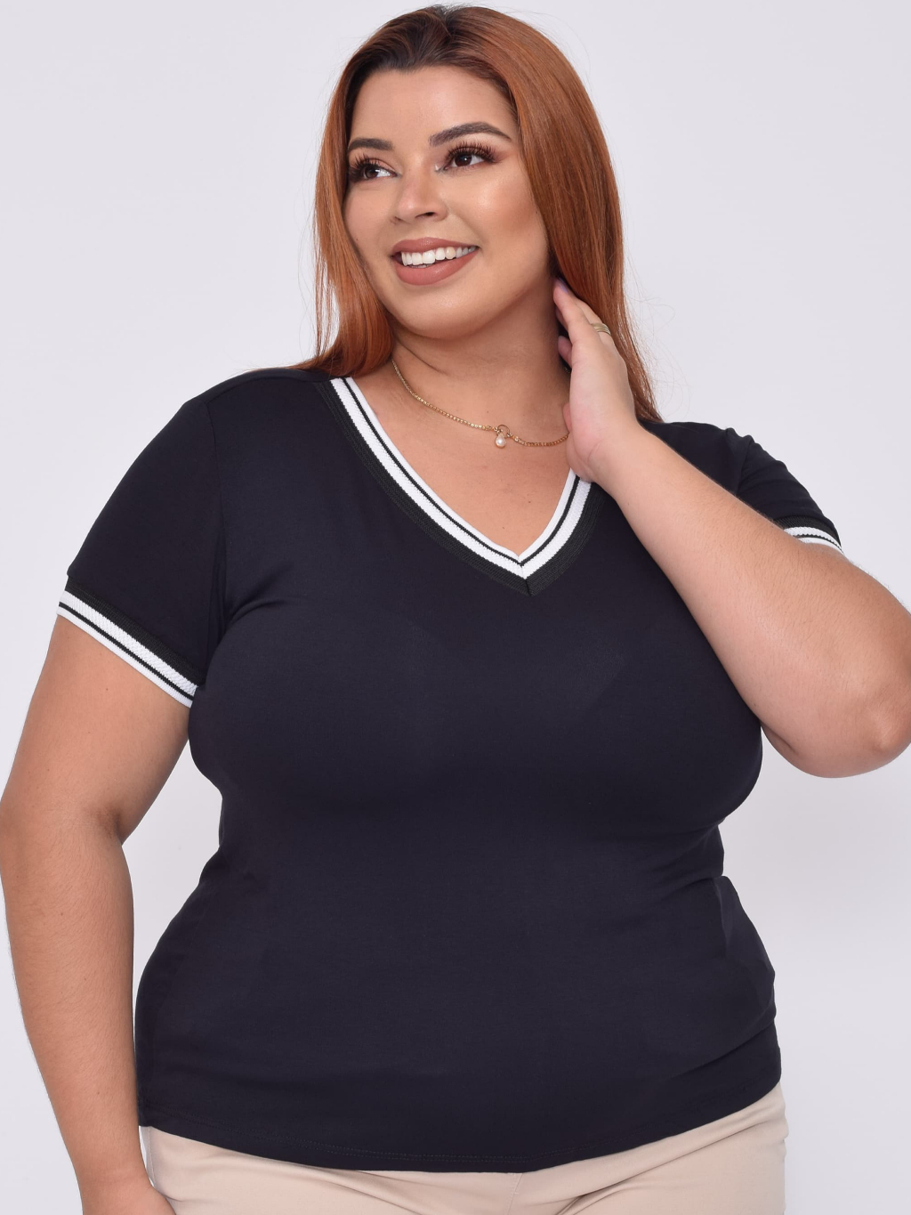 Kit 3 Blusas Feminino T-Shirt Básica Malha G e GG Plus 44/46/48 Detalhe Gola V Casual Confortável