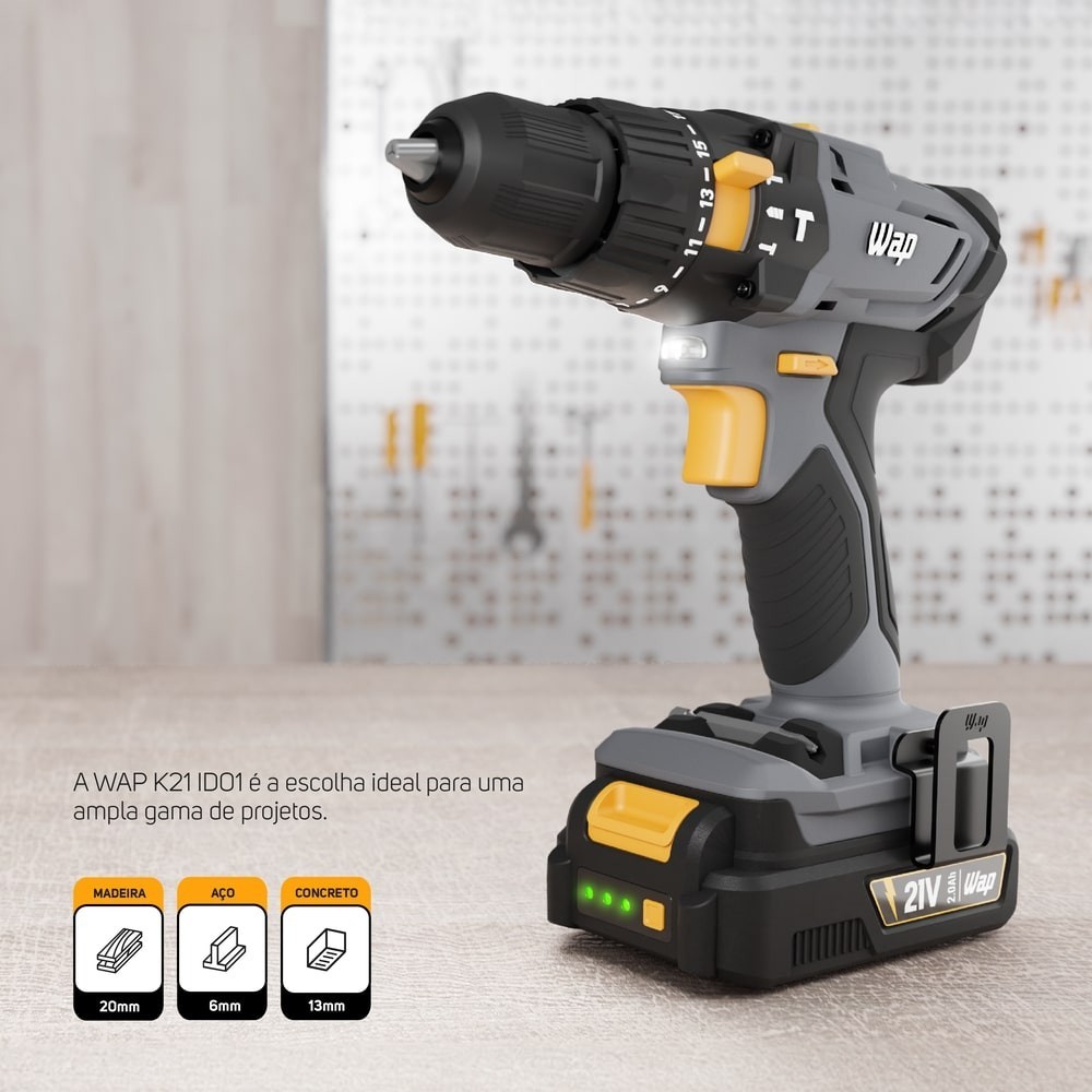 Parafusadeira e Furadeira de Impacto WAP K21 ID01 A Bateria Torque de 45 Nm e Mandril 3/8"