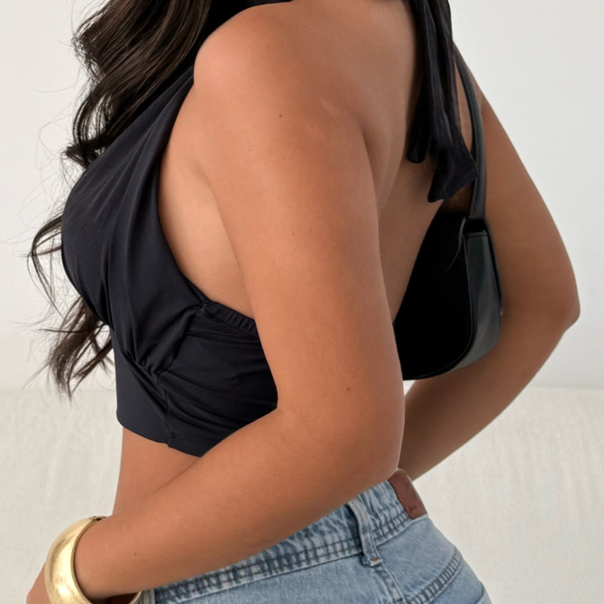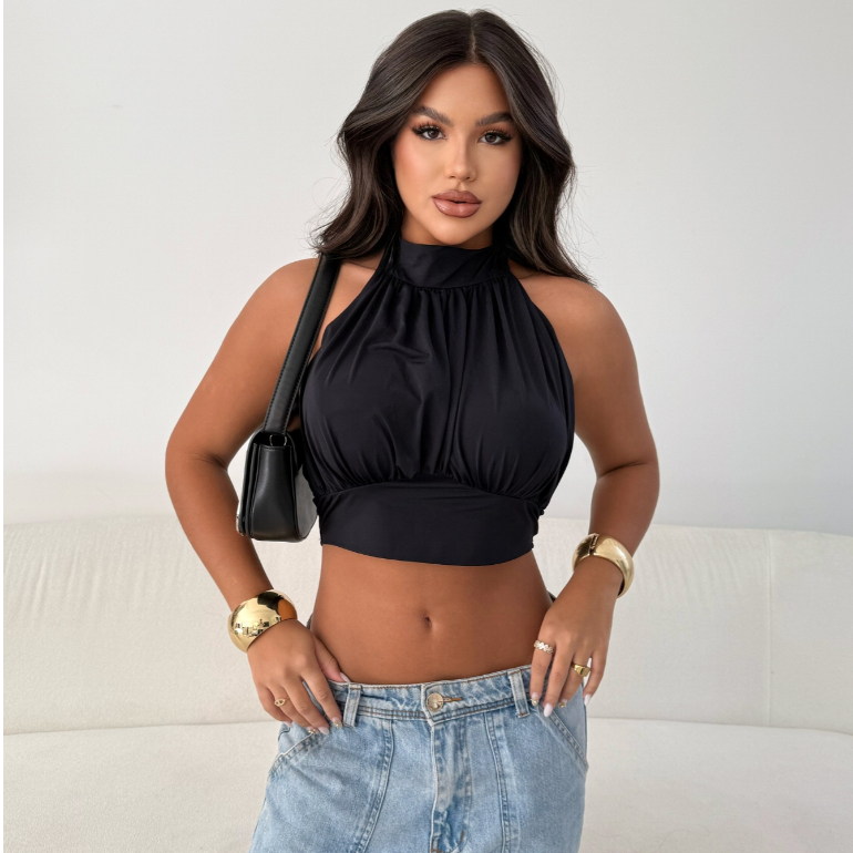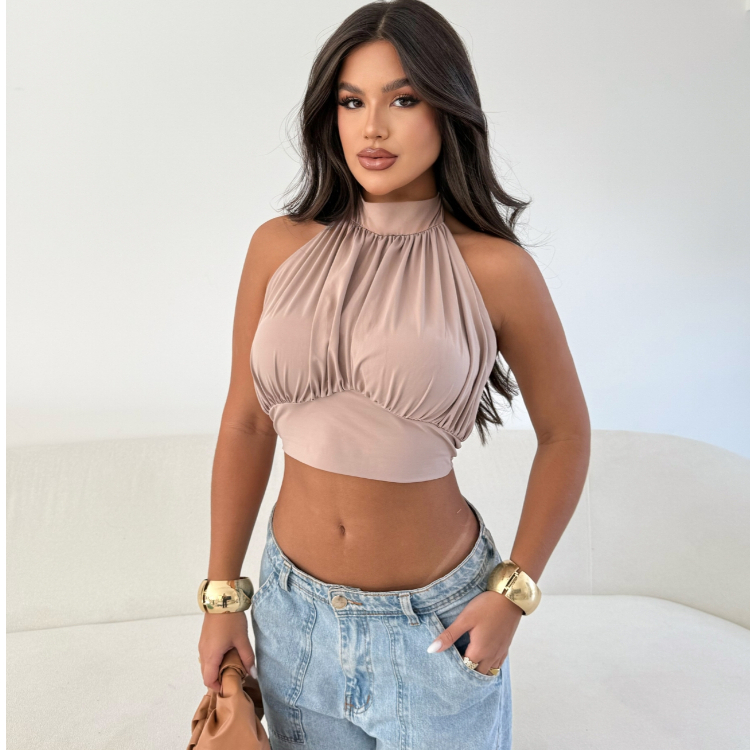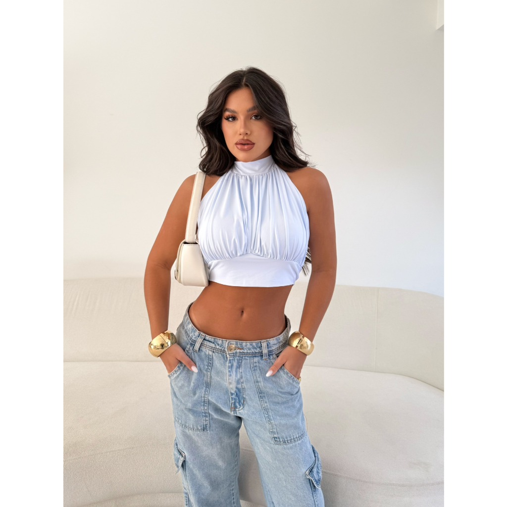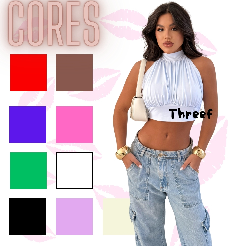 Cropped Feminino Balone Com Bojo E Gola Alta Plissado Costa Nua
