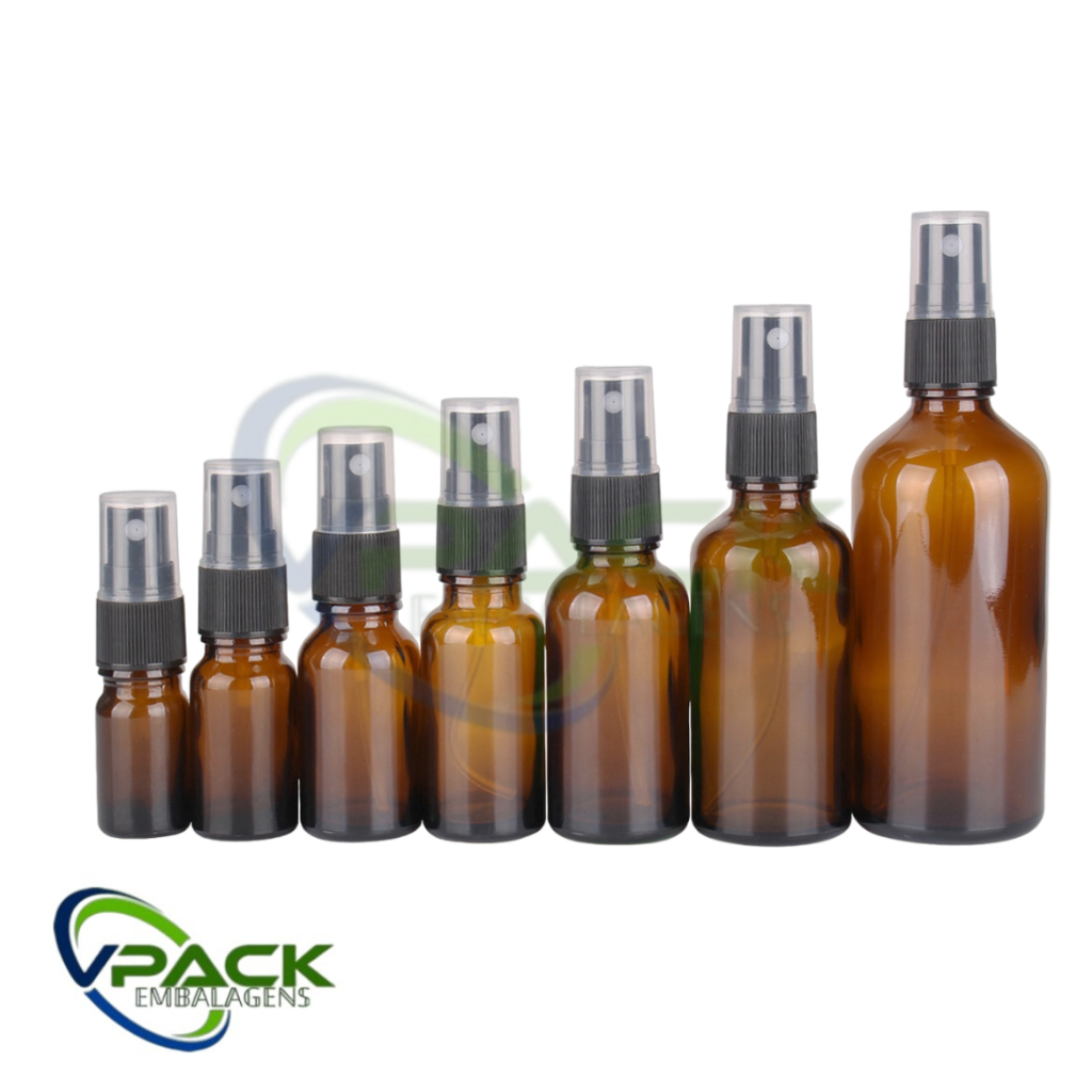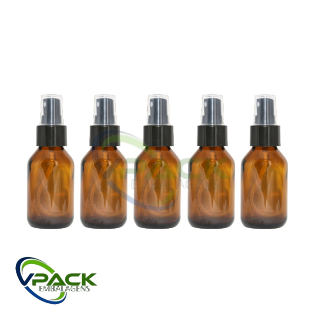 kit 5 Frascos De Vidro Âmbar 60ML Com Válvula Spray Preta ou Branca