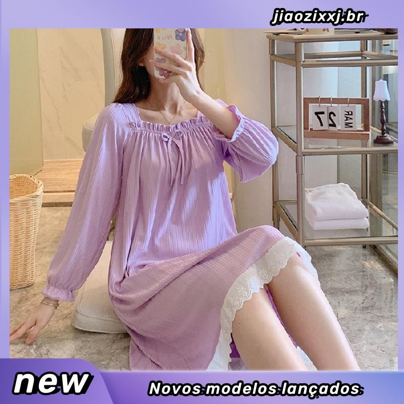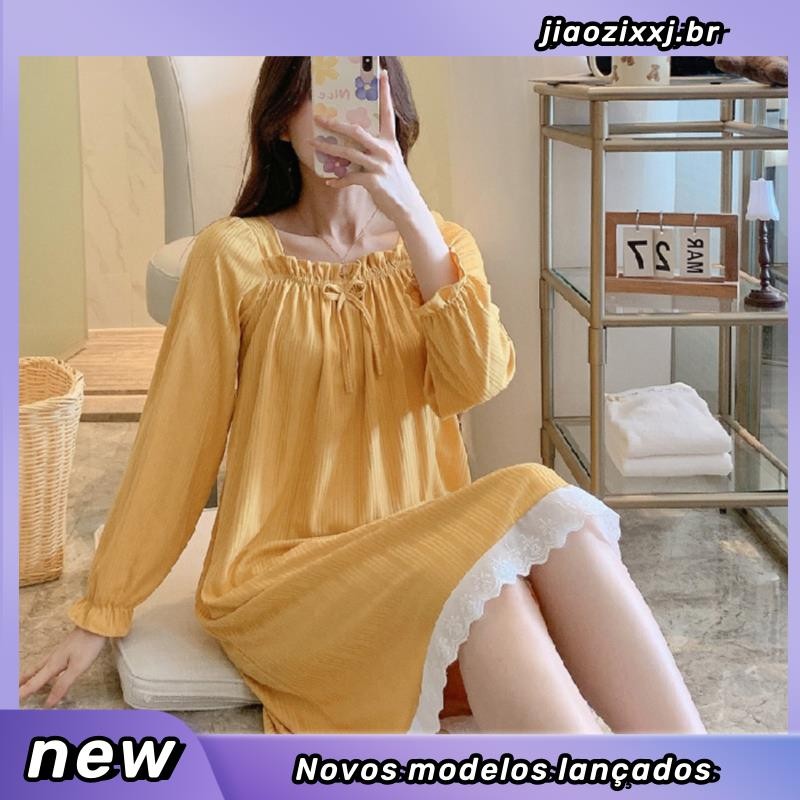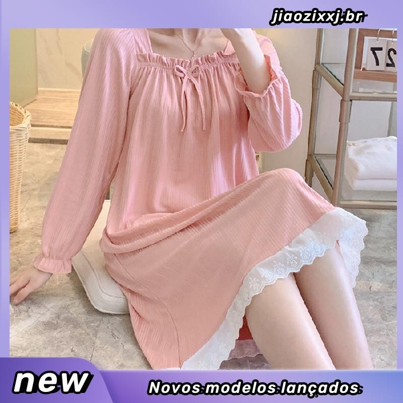 Mais Tamanho M-XXL Mulher Pijama Manga Longa Vestido De Algodão Longo Para Dormir Nighties