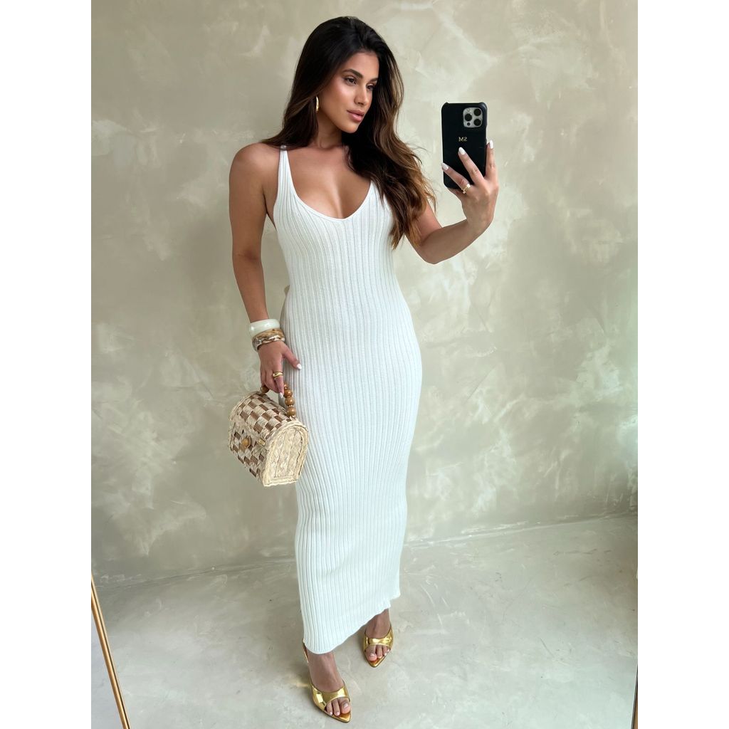 Vestido Longo Tricot Canelado Feminino Modelo Ajustado Decote Profundo Alças Cruzadas Costas Elegante Moda Feminina
