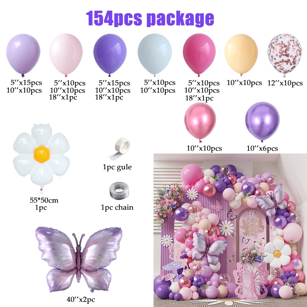 154pc Macaron Balão De Borboleta Rosa Púrpura Garland Yellow White Daisy Flower Foil Helium Ball Casamento Aniversário De Baby Shower Deco
