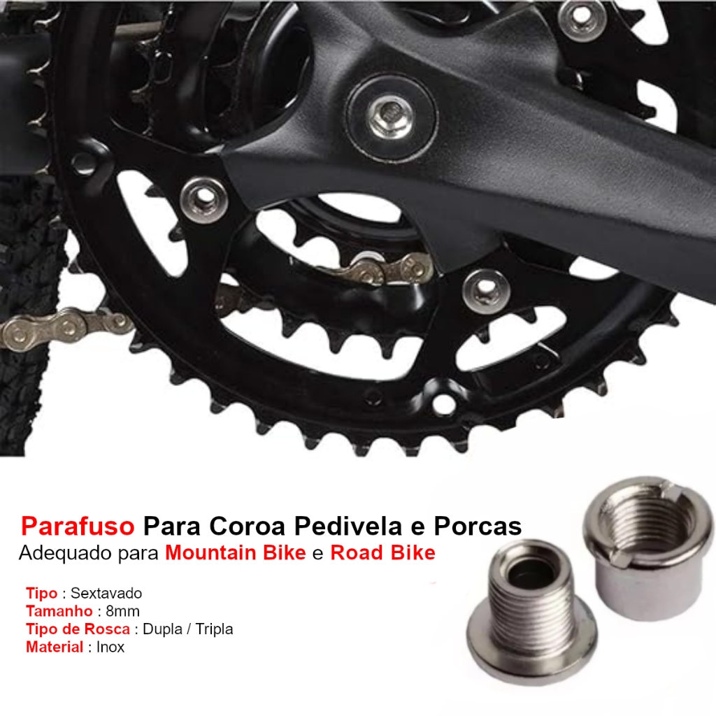 Parafuso Coroa Pedivela 8mm Engrenagem Dupla e Tripla Bike Bicicleta Inox Rosca Dupla e Tripla Sextavado