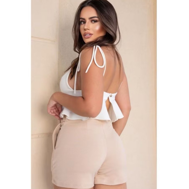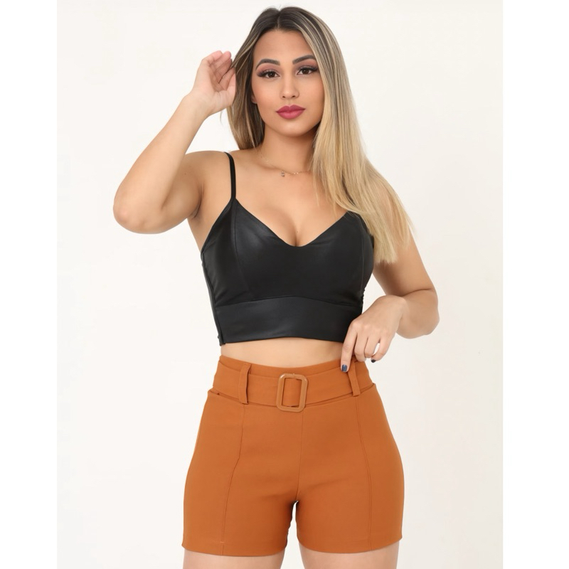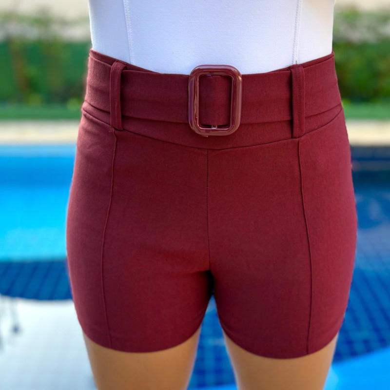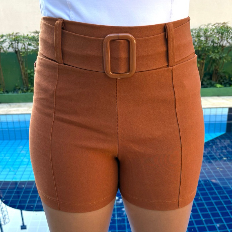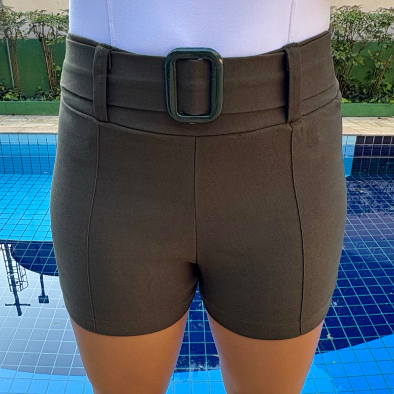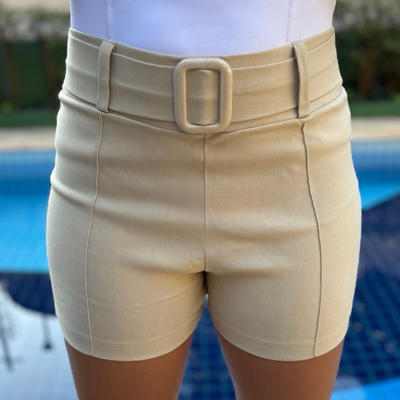 Shorts Liso com cinto fivela Bengaline Social Com Bolso Cintura Alta Elastano