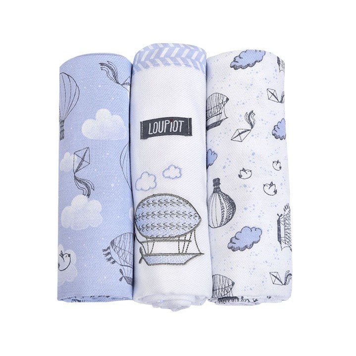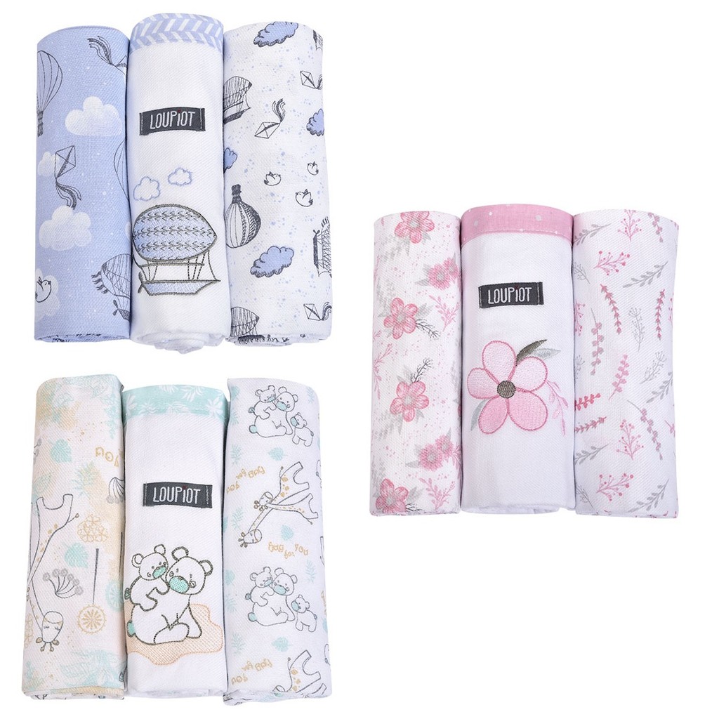 Kit Cueiro Manta para Bebê 3 Peças Bordado Premium 100% Algodão 80x80 Loupiot Minasrey Enxoval RN