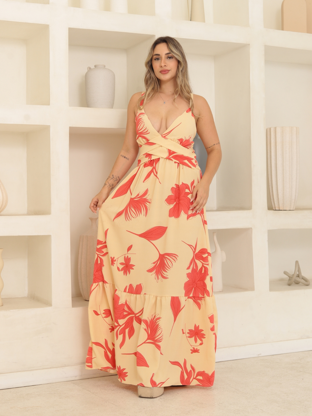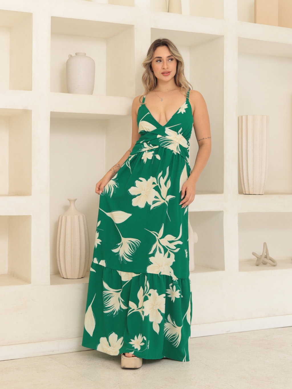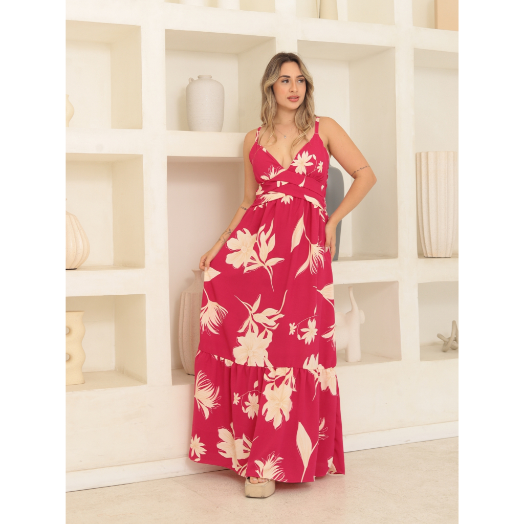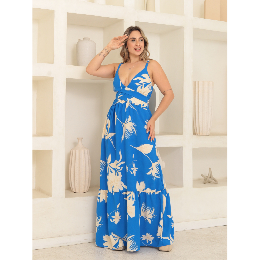 Vestido longo de alça duna estampado decote V 5009