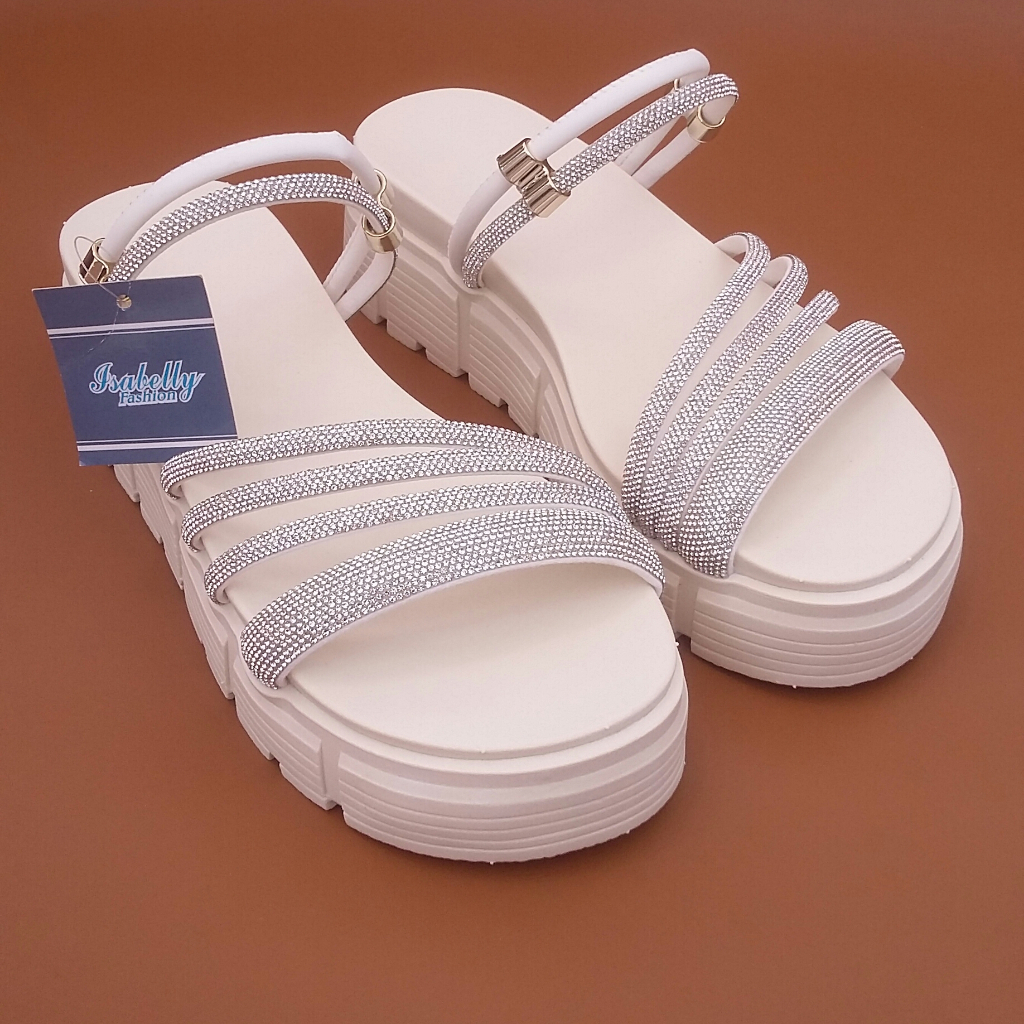 Sandalia Papete Plataforma Birken Flat Com Brilho Leve Pedraria Tiras Promoção